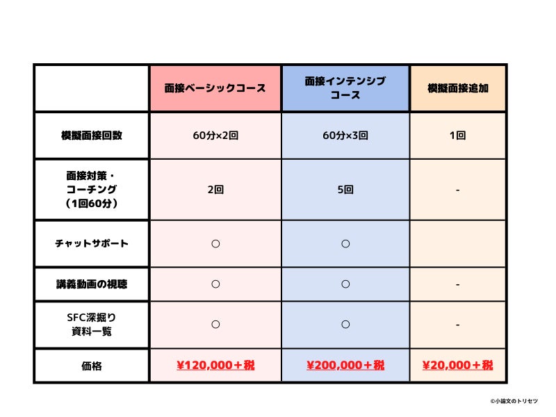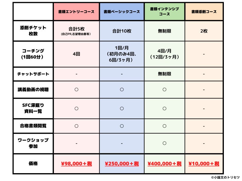 高校3年生、既卒生向けコースは書類コース、面接コースの2つに大分されます。その中でも受験までの日数やサポートの度合いによりパックを選択いただけます。