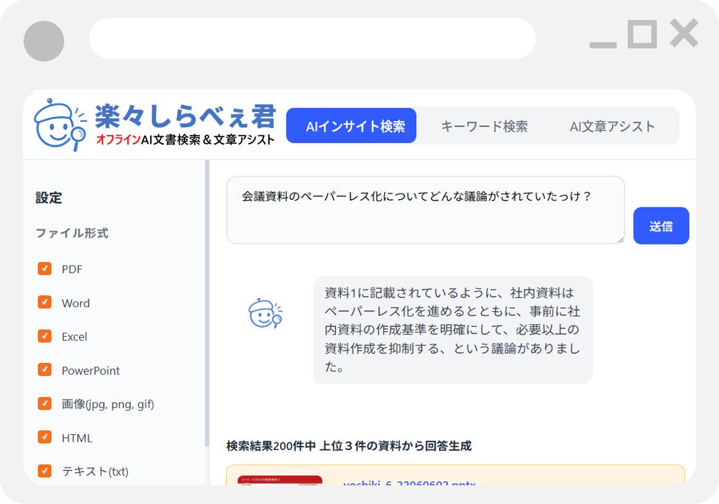 しかし『楽々しらべぇ君』はPC内にインストールする形式のため、その利用価値はRAGによる回答生成にとどまりません。クラウド上で限定されたファイルを扱う一般的なRAGと異なり、『楽々しらべぇ君』はユーザーのPC内に存在する膨大なファイル群を、そのまま“検索対象”として扱います。その結果、高性能な「PC内部検索エンジン」としての価値も発揮します。