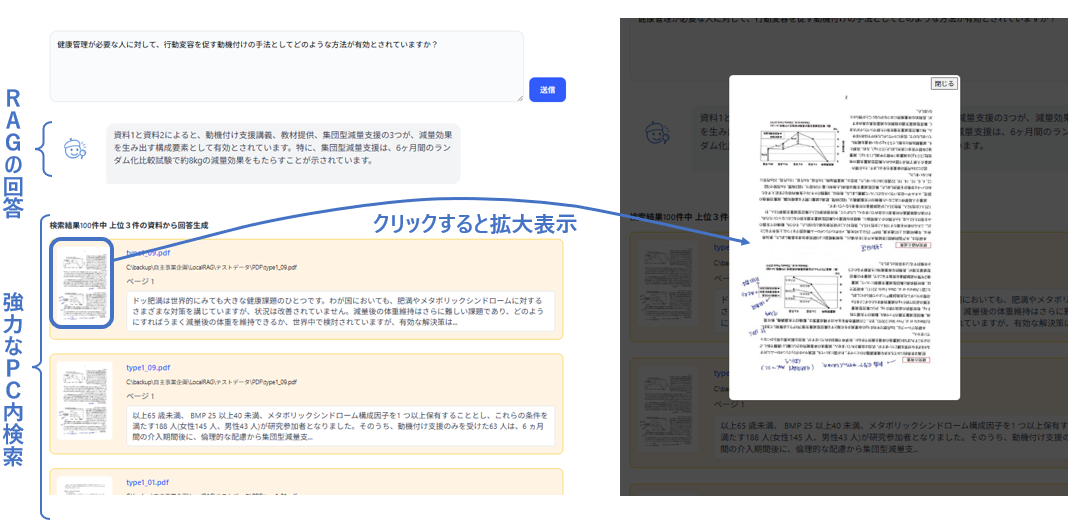 キーワードや質問文を入力するだけで、膨大なPC内ファイルの中から関連性の高い資料を瞬時に検索・提示。さらに、RAGによる回答結果とあわせて、根拠となった検索結果ファイルを同時に確認することができます。