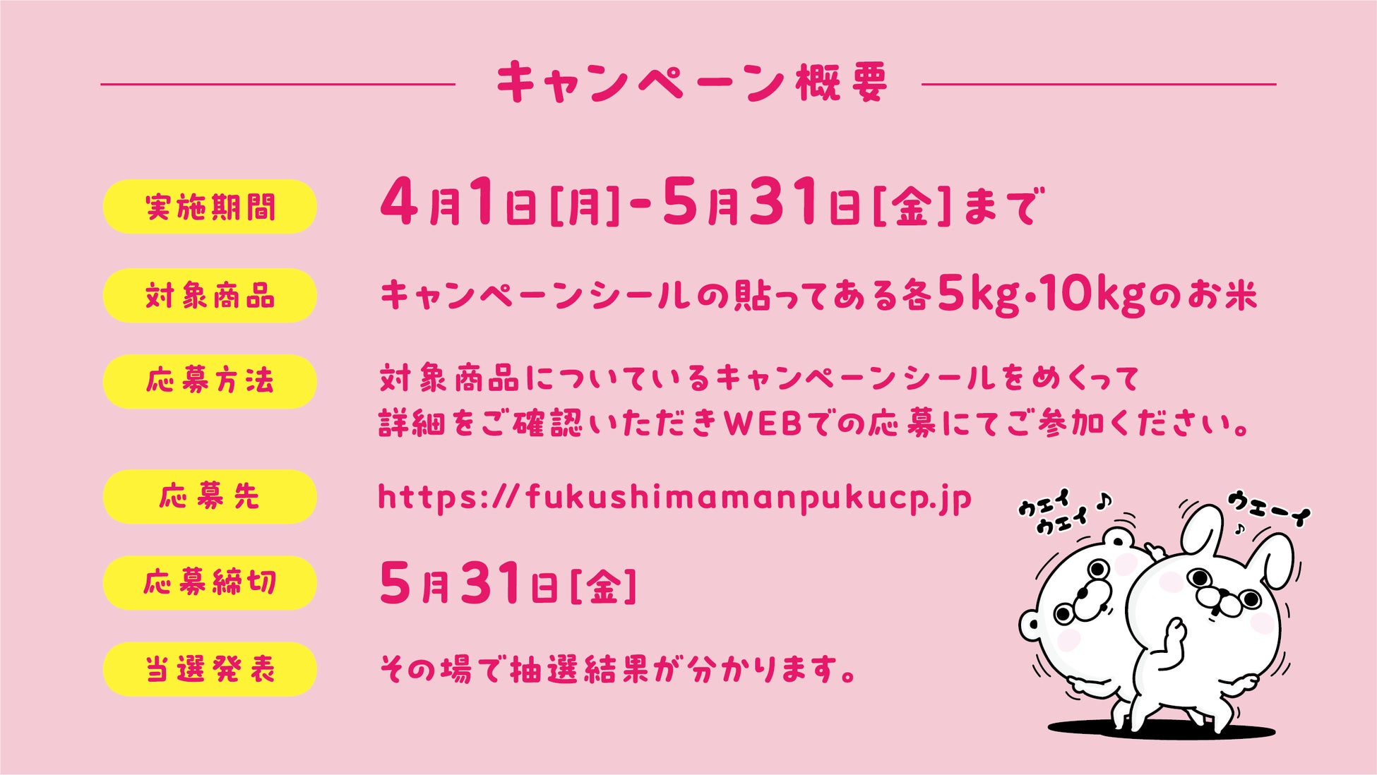 応募先:〒550-8691 日本郵便(株)大阪西郵便局私書箱101号 株式会社DNPコアライズ内 「ふくしまの米 春満開!食べて満福キャンペーン事務局」