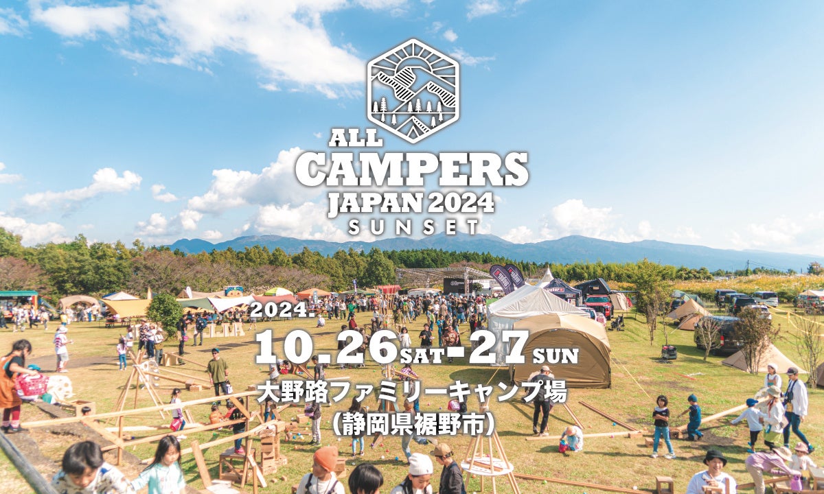 All Campers Japan 実行委員会(事務局:株式会社アウトオブドア内)が主催するキャンプフェス「All Campers Japan 2024 SUNSET」(https://allcampersjapan.com/)が大野路ファミリーキャンプ場(静岡県 裾野市須山2934-3)にて2024年10月26日(土)〜27日(日)の2日間開催。音楽ライブ、キッズエリア、ハロウィン仮装大会、運動会プログラムなどファミリーで楽しめるのが特徴。チケットはプレイガイドにて販売中。