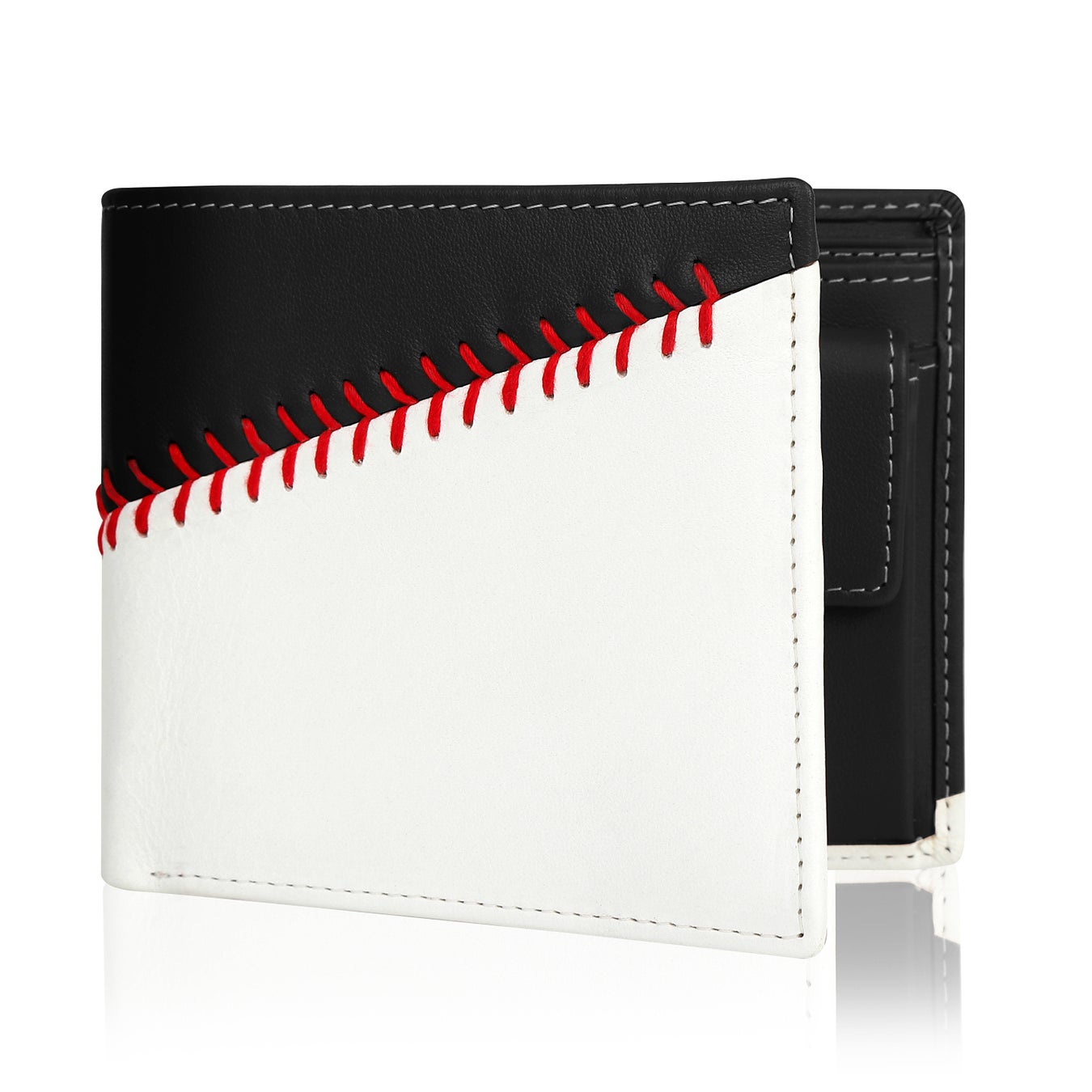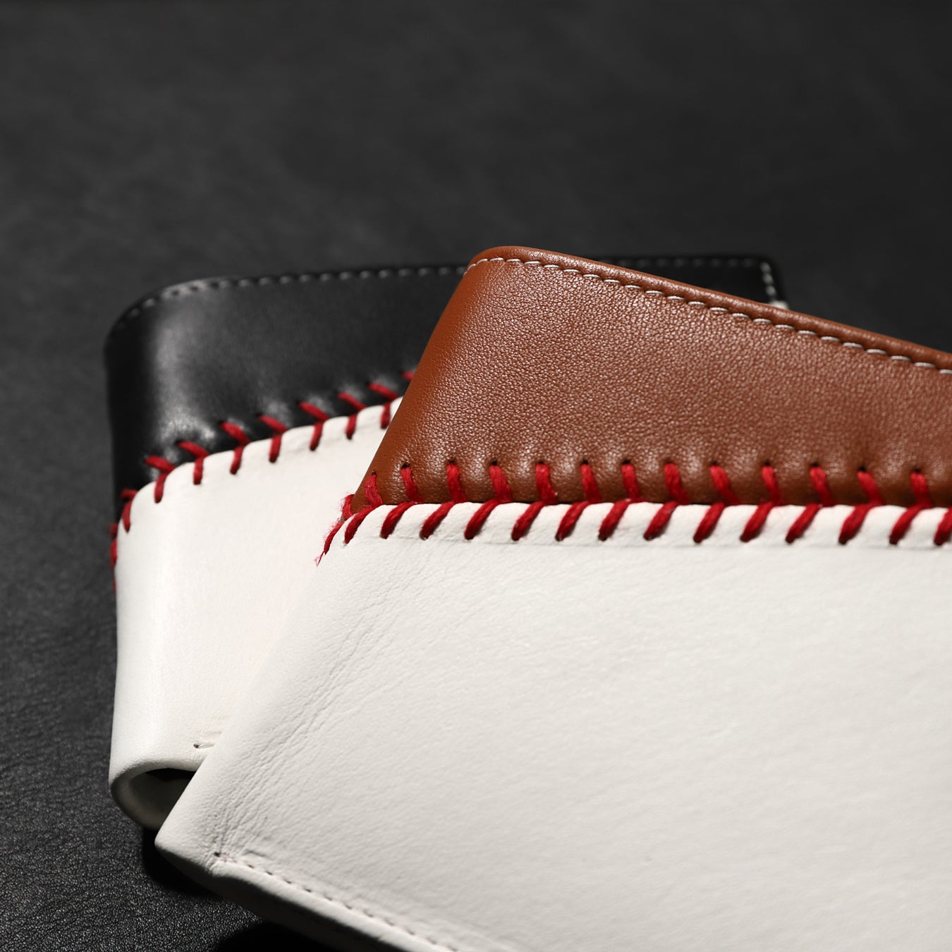 野球ボール革とグラブ革のコンビネーション!赤い縫い目を生かした革財布が登場!