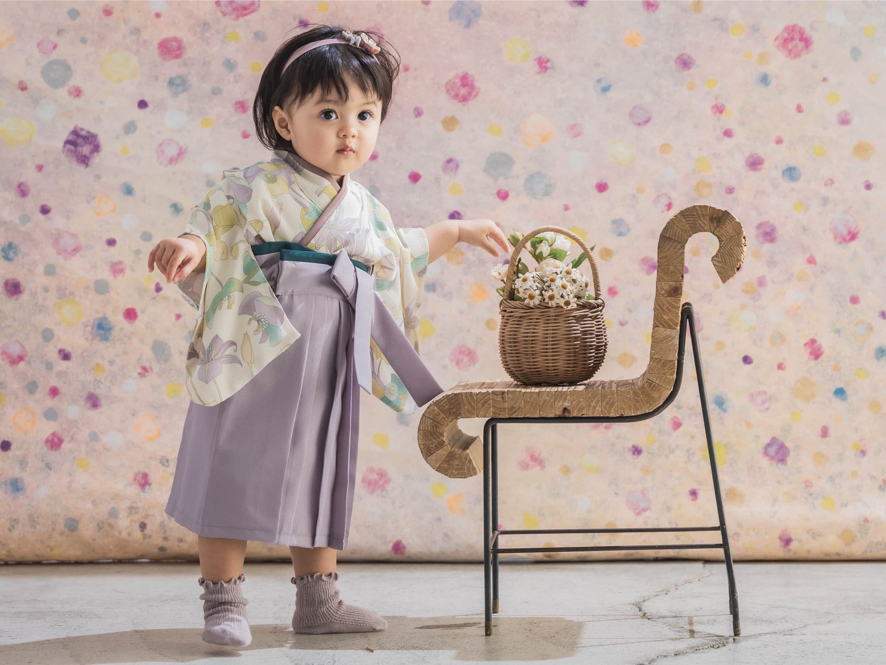 女の子は、淡いラベンダーピンク色のベースに白色のお花。