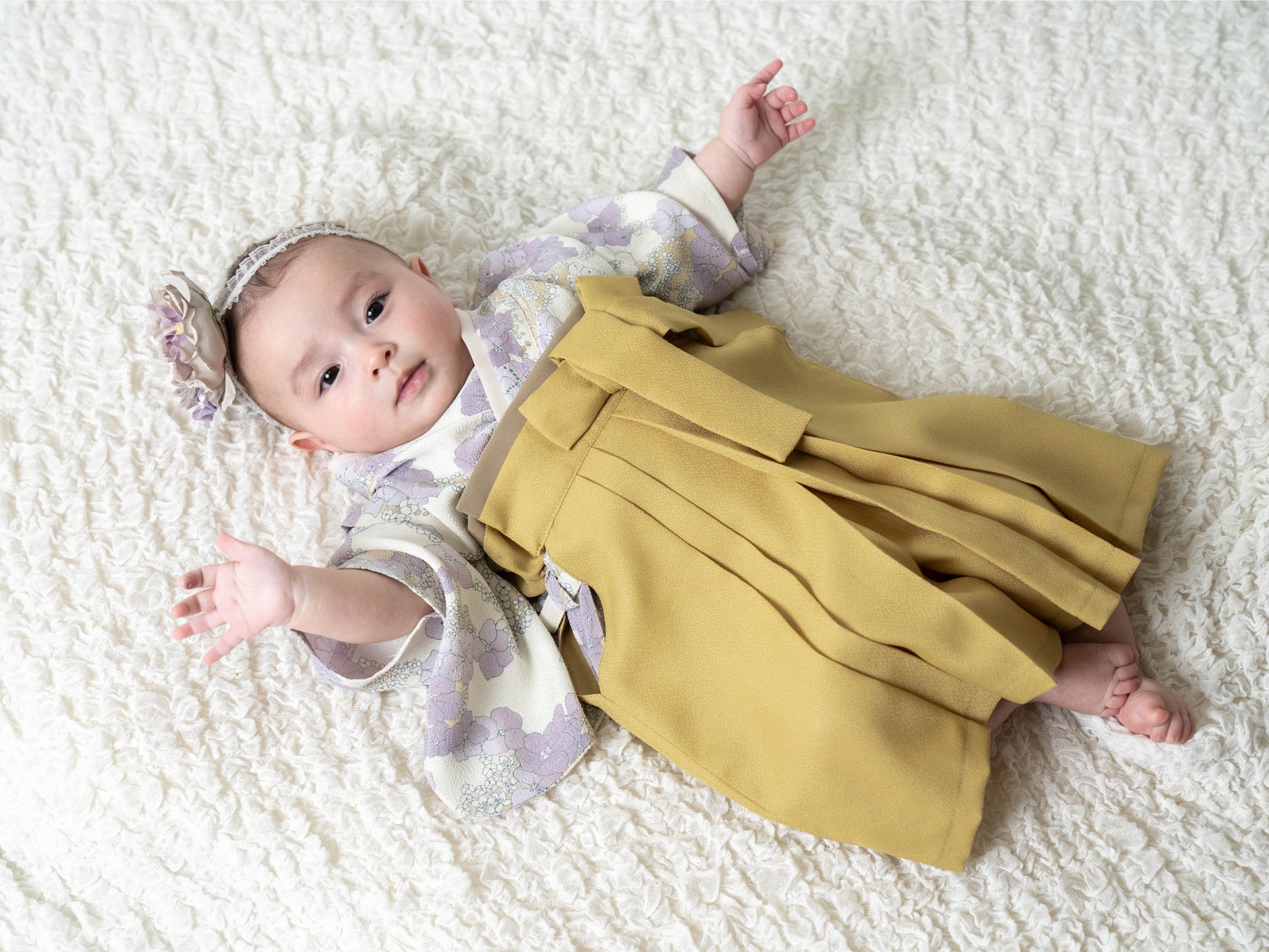 くすみ感のある落ち着いた黄色の袴を合わせ、繊細かつ華やかな雰囲気の一着です。