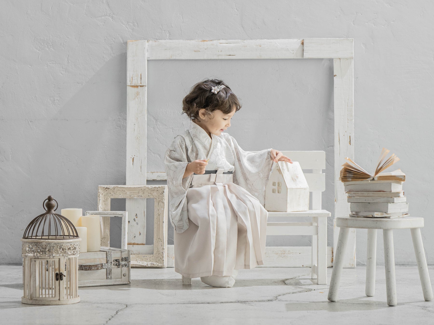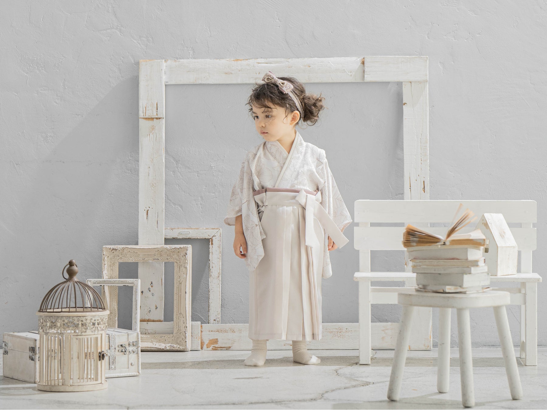 新色のエクリュ色の袴を合わせ、全体を淡い色味でまとめました。