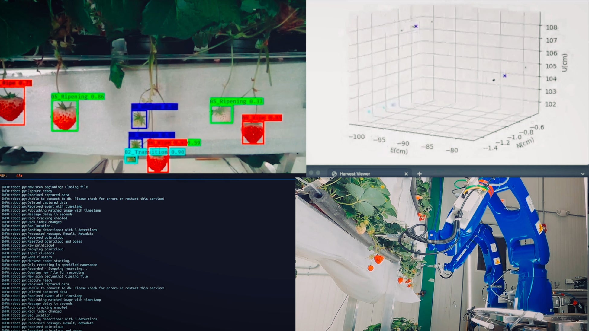 農場ユニット内では、ロボットが24時間いちごの成長を見守りながら、完熟したタイミングで自動収穫し、オペレーションの効率化を図っています。また画像認識技術とAI(機械学習)によって、年間600億ものデータを取得しながら、各農場ユニット内の環境を日々把握・調整することで、受粉成功率や収穫量の予測精度の向上に繋げています。