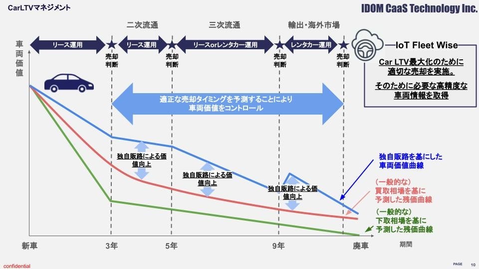 Car LTVを最大化するためにはクルマの過去・現在・未来の価値算定を高精度で行う必要があり、ICTはAWS IoT FleetWiseから取得される車速やエンジン回転数などの情報を活用することで、これまでと比較して格段に精度の高い残価予測を行うことができるようになりました。