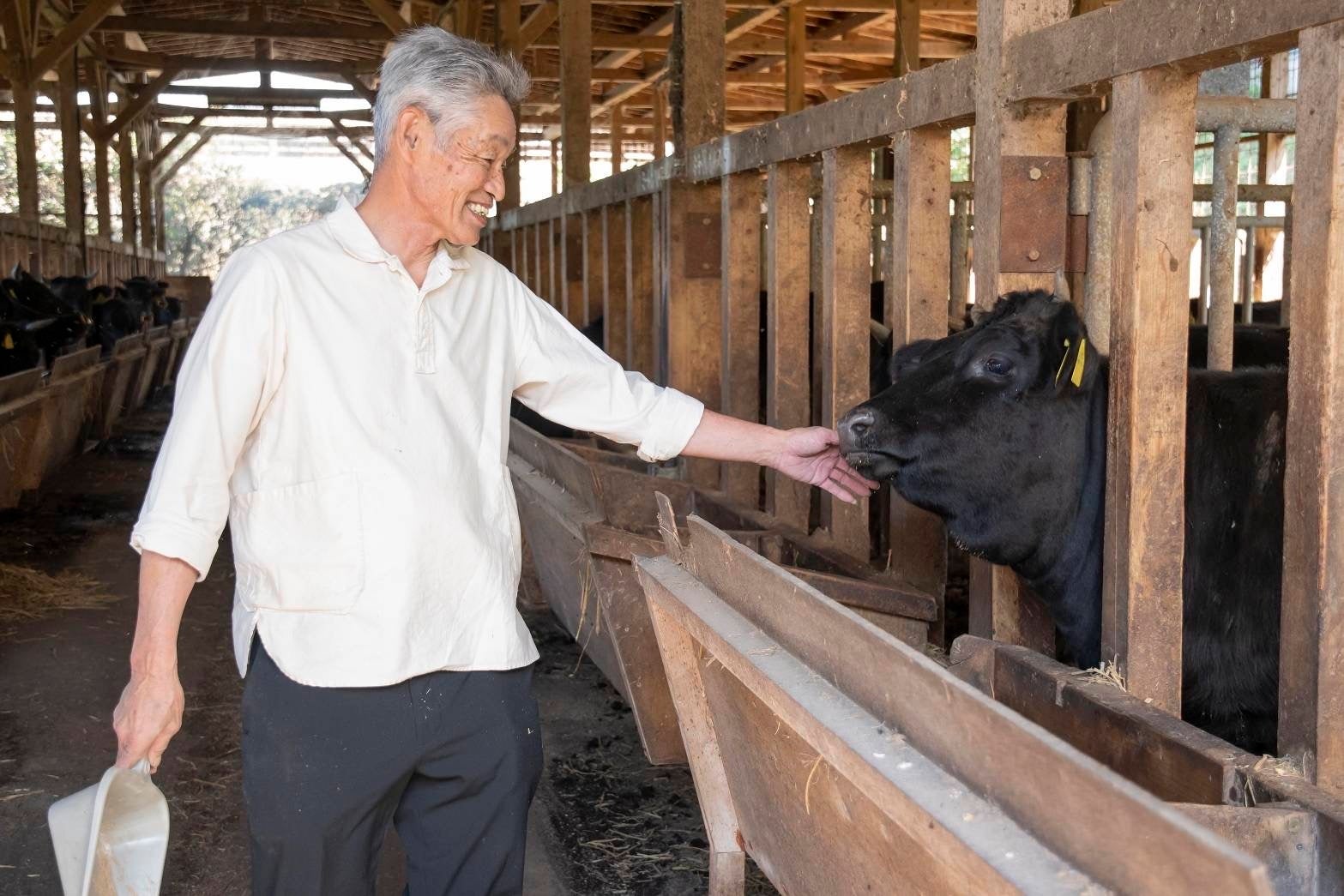 代々100年にわたって昔ながらの飼育方法を引き続きながら、今や希少価値となった本物の特産松阪牛を三重県多気町で丁寧に育てる畜産家。三重県多気町は、何度も日本一と称されたきれいな水と温暖な気候に恵まれた地。牛を育てるには最高の環境です。牛舎を見回り、餌をやりながら一頭一頭優しく声をかけ、頭を撫でていき大切に育てています。