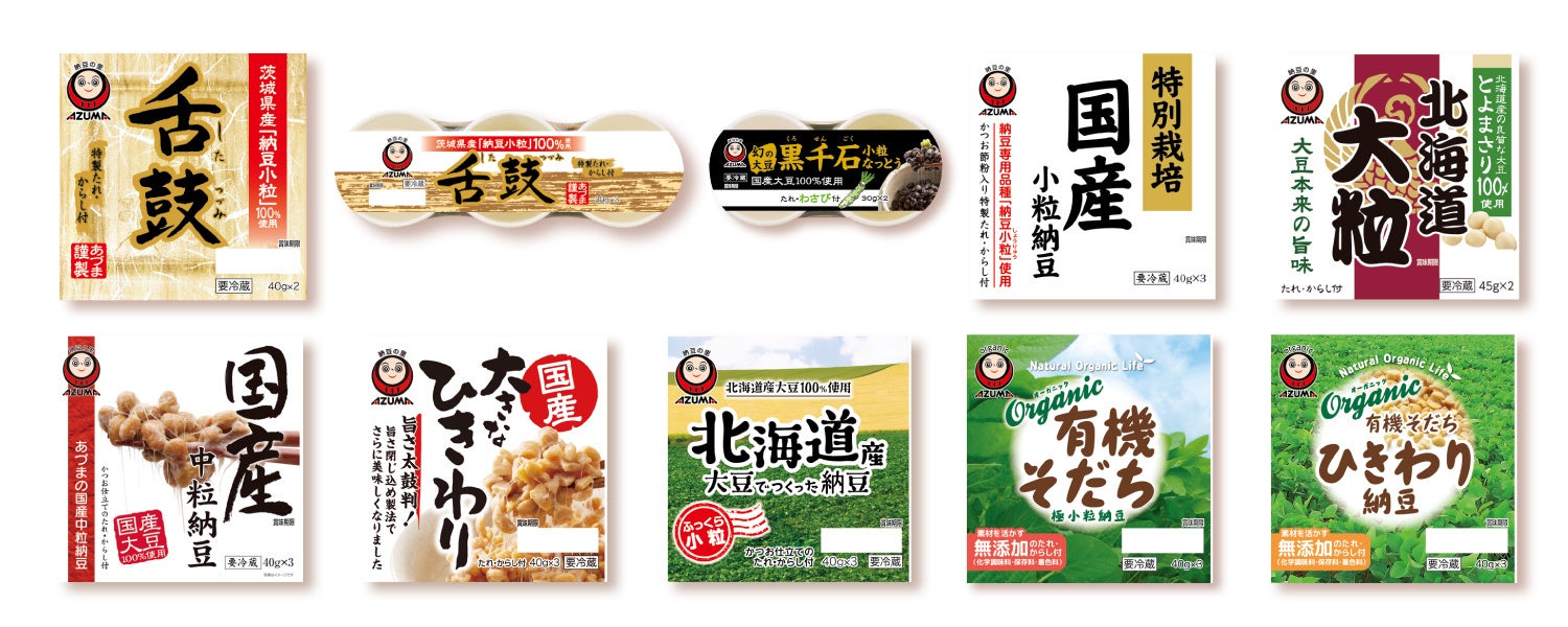 茨城県産の納豆専用大豆「納豆小粒(しょうりゅう)」を使用した『舌鼓』、安心・安全にこだわった『有機そだち』、大豆の旨みと食感が特長の『国産大きなひきわり』、幻の大豆を使用した『黒千石(くろせんごく)小粒なっとう』等、あづま食品のこだわり納豆10商品が対象です。