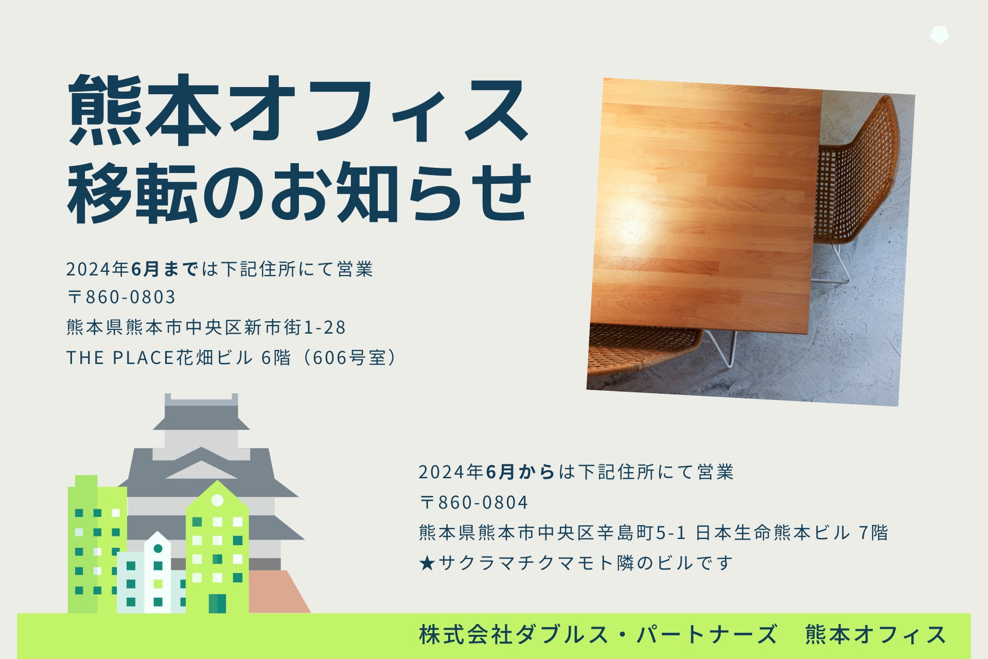 株式会社ダブルス・パートナーズは、熊本オフィスを移転することをお知らせいたします。