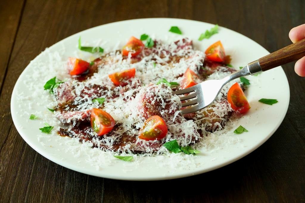 6時間かけてじっくり火入れしていく、とろける様な食感の牛のカルパッチョ。安心安全なカルパッチョです。