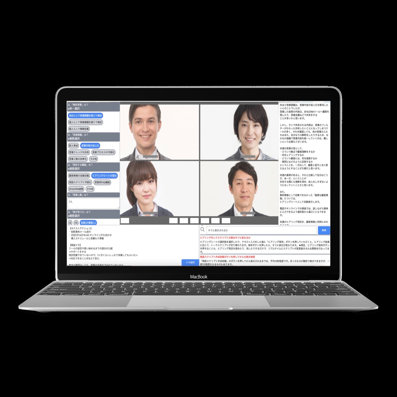 現在のβ版では、ヒアリングシート機能、LIVEスクリプト修正機能、営業用FAQ機能も搭載され、顧客と電話や商談で会話をする際に、覚えていなくても、思い浮かばなくても、伝える内容をサポートしてくれるツールです。
