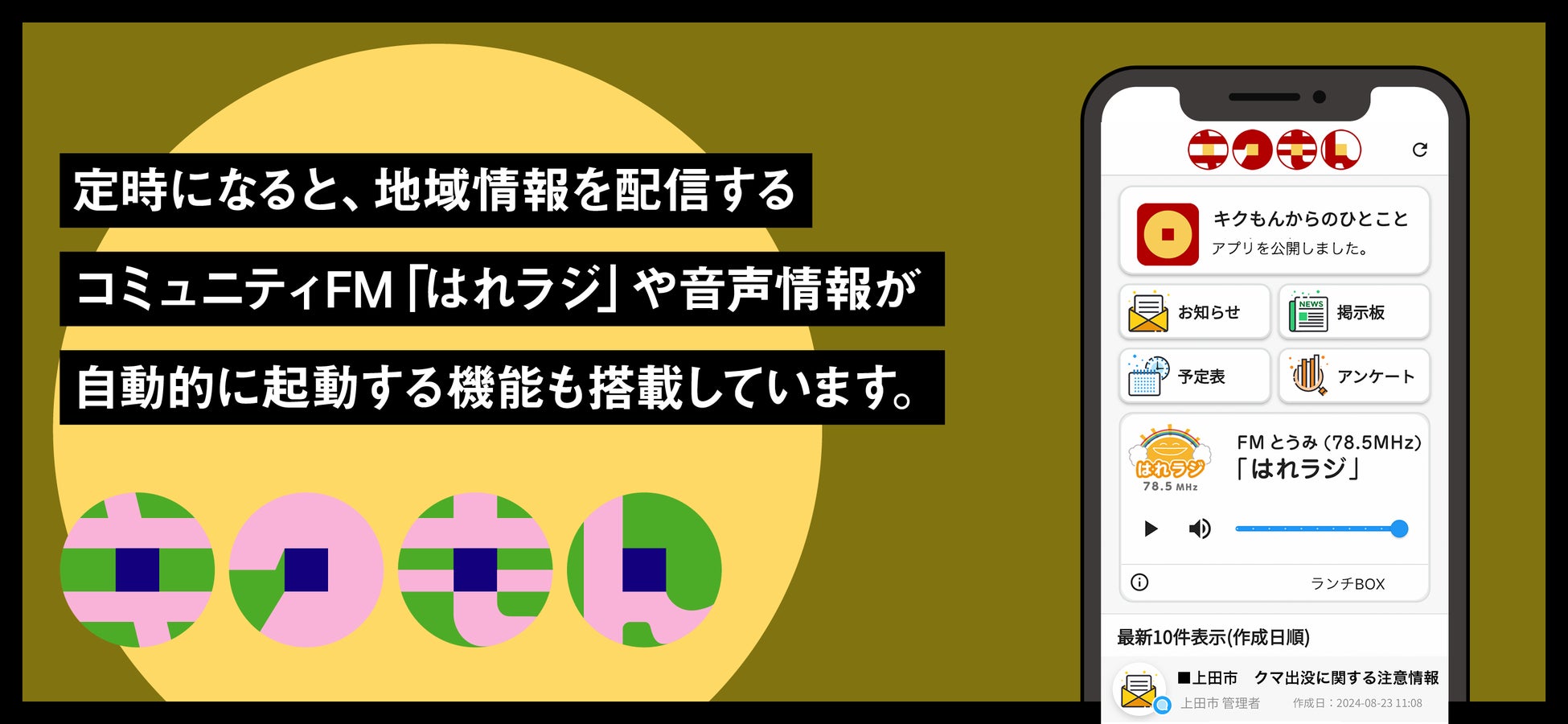 「キクもん」は、地域住民向けに情報発信・共有を目的としたスマートフォン向けのアプリです。