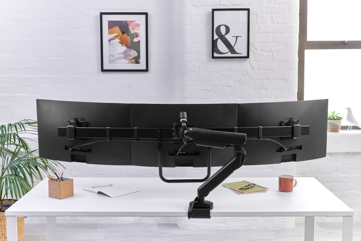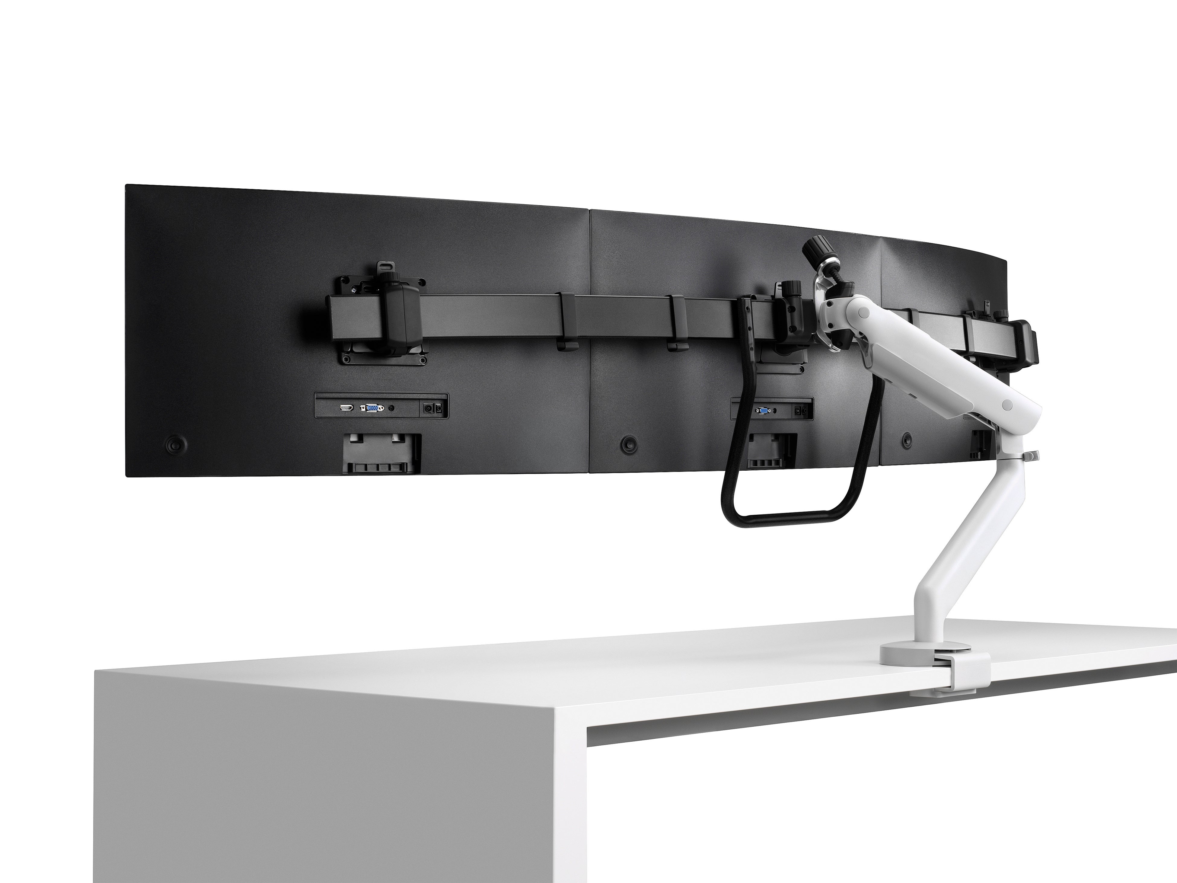 特許取得済みのダイヤモンドDリングチルトを持つFlo Xは、指先での調整とバランスの取りやすさといったこれまでの利点はそのままに、より大きなモニターやカーブモニターにも対応できるようになりました。これにより34インチのデュアルモニター、27インチのトリプルモニターもサポートが可能になりました。