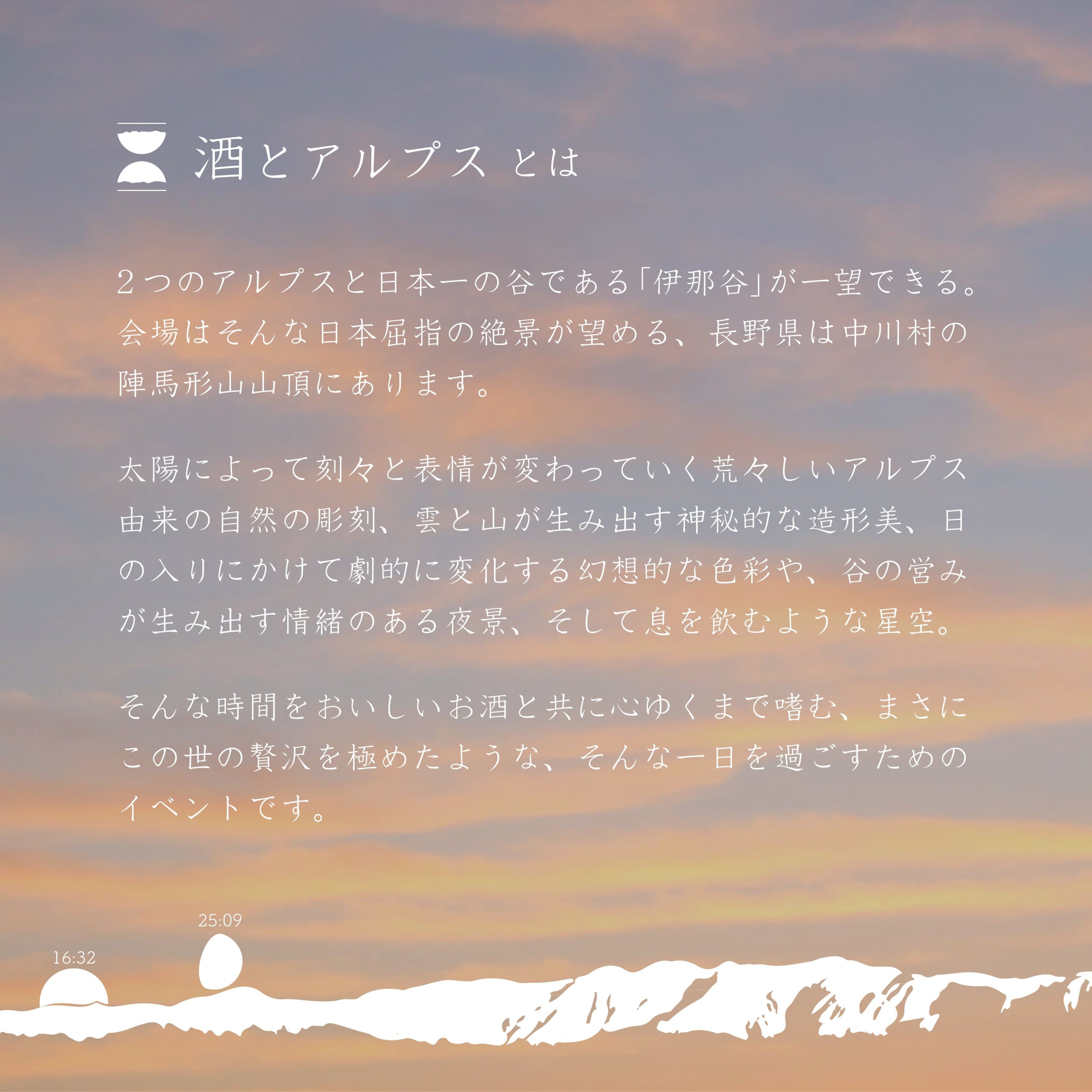 日本一の谷と2つのアルプスを見渡す陣馬形山頂にて、絶景+美酒美食+音楽イベント。11月3日 【酒とアルプス】を開催します!