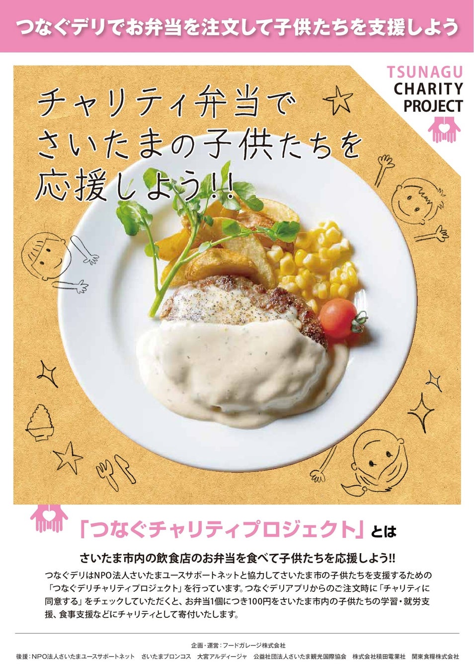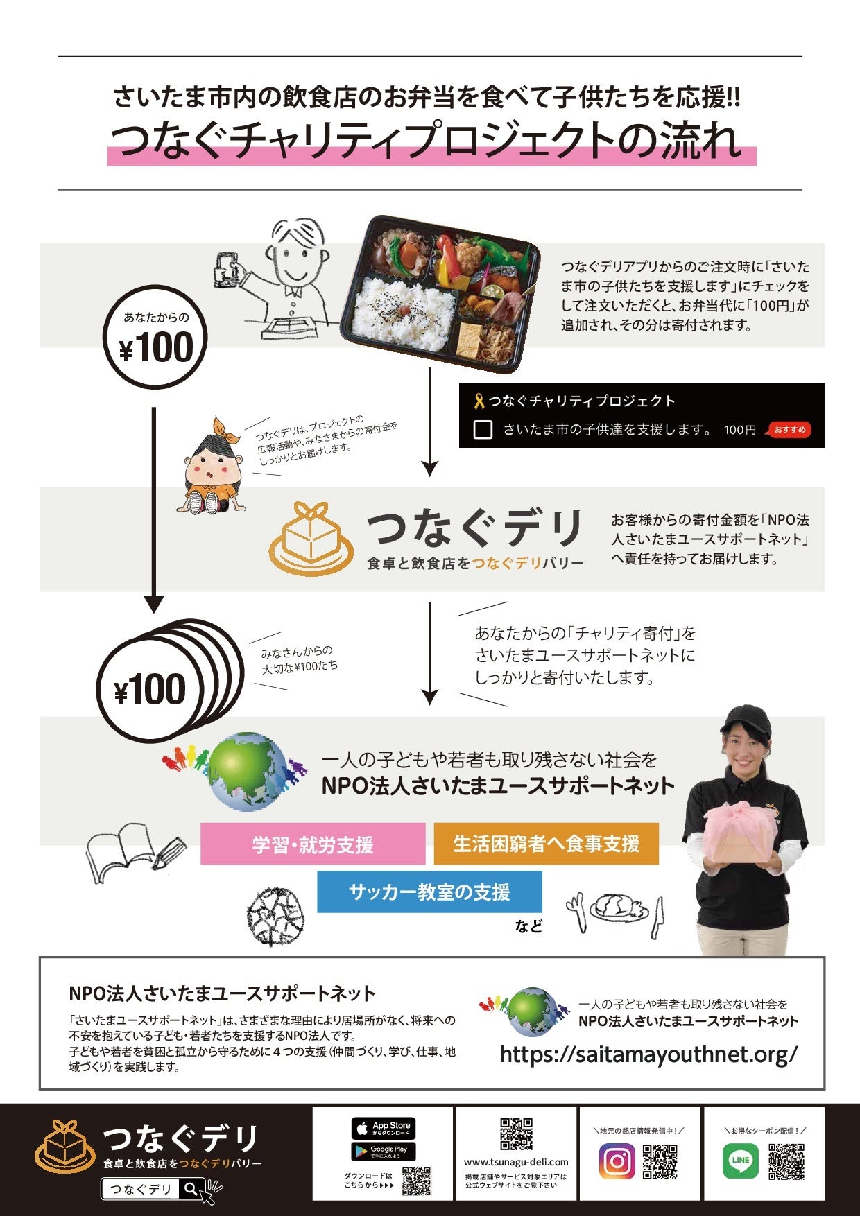 つなぐデリアプリよりチャリティ弁当を1個注文により「NPO法人さいたまユースサポートネット」を通じて基金対象のさいたま市の子供達に100円寄付される仕組みとなっておりります。