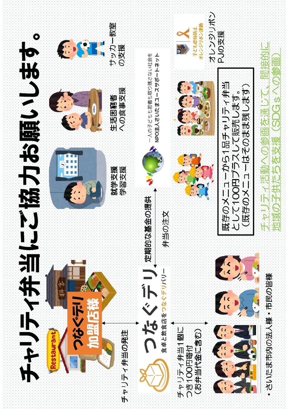 さいたま市内の法人様・市民の皆様がつなぐデリアプリよりチャリティ弁当をご注文頂くだけで、お弁当1個につき100円が子供達への支援となる仕組みで、便利に美味しくお弁当を食べて寄付も出来る仕組みです。