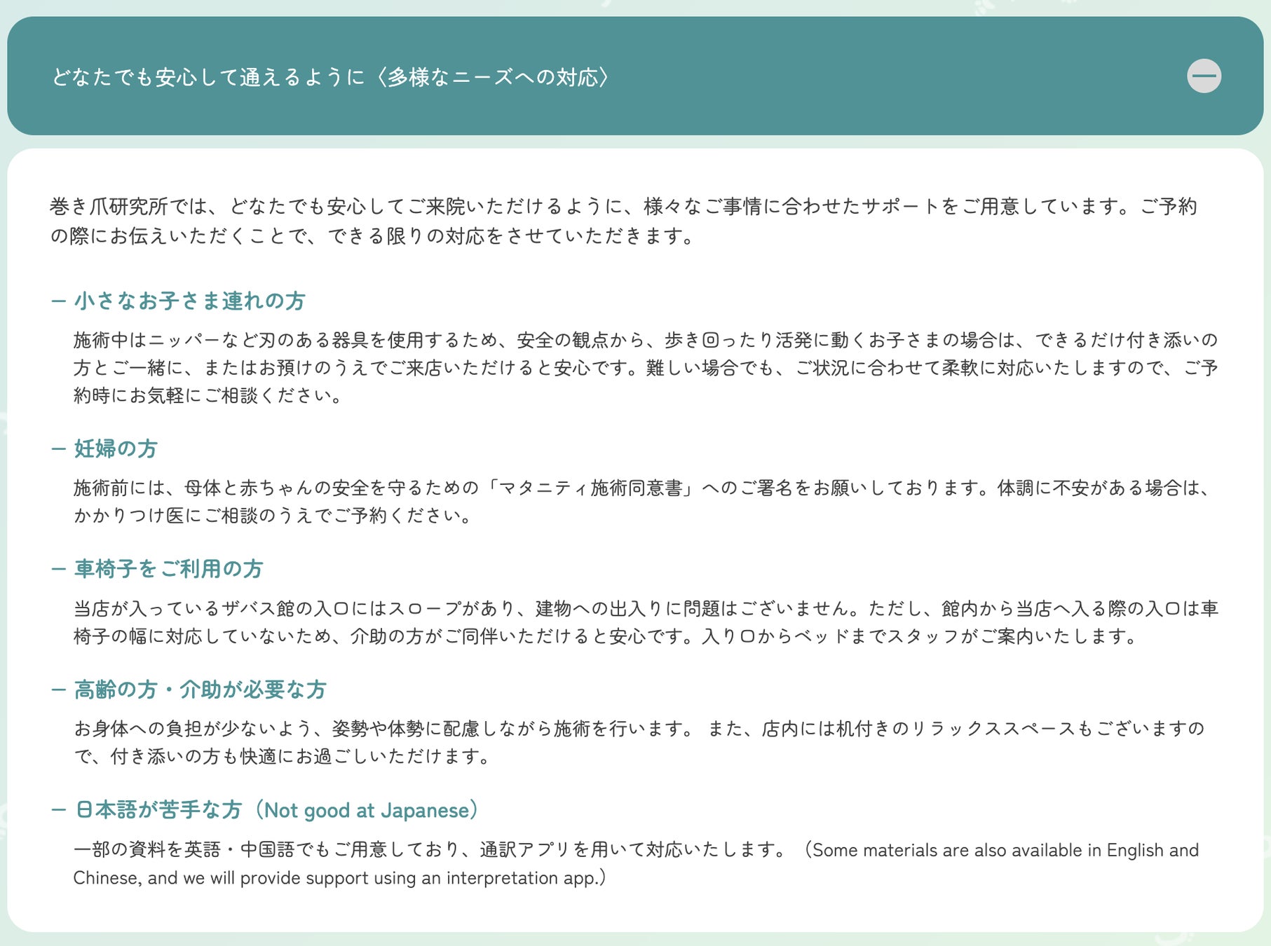 こうした背景を踏まえ、巻き爪研究所では「来店前に、自分の悩みがどのケアに該当するのかを把握できる」ことを目的に、店舗ページを以下の4カテゴリに分けて情報提供を行っています。