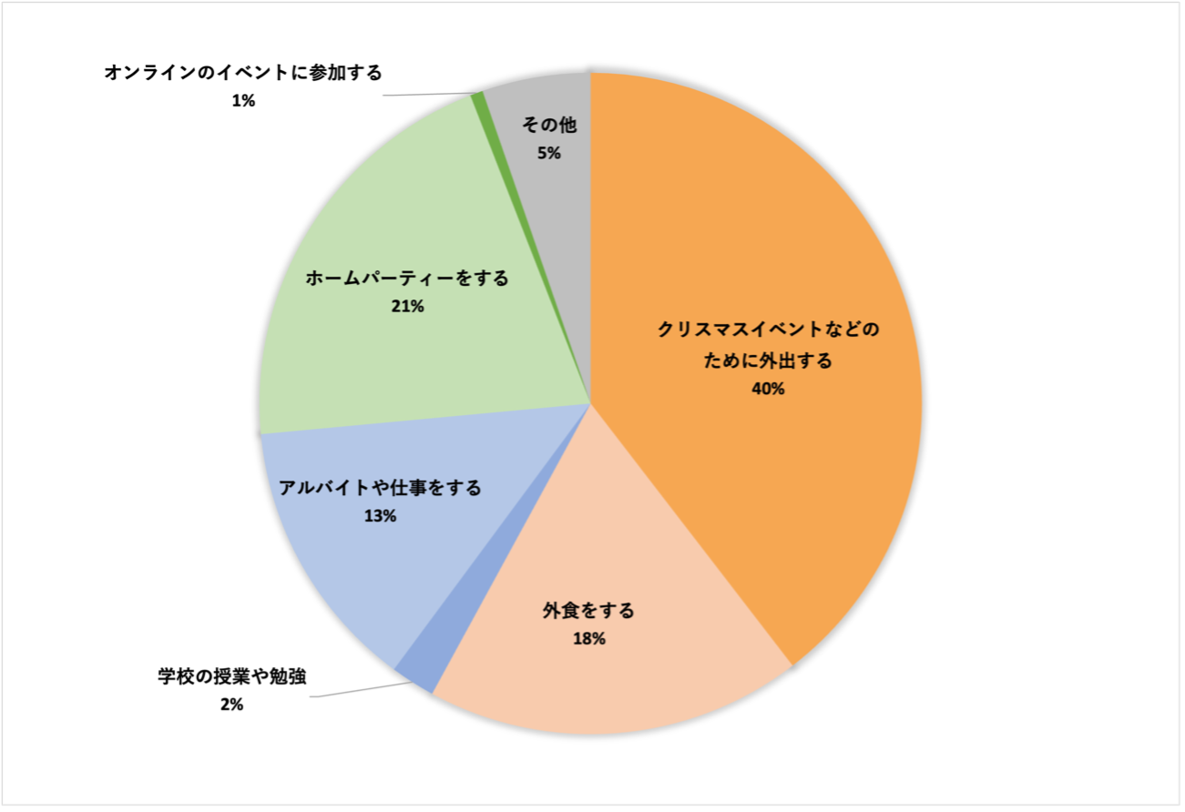 緊急事態宣言が解除されても、平日の夜の外食はまだまだ例年通りとはなっておらず、クリスマスのイベントの時くらいは「非日常を味わいたい」「気分転換したい」と考えている学生も多く見受けられた。また、「クリスマスをきっかけに外出できたり人と会いやすかったりする」と回答した学生も多く、外で楽しむきっかけとしてクリスマスに予定を立てているとも考えられる。
