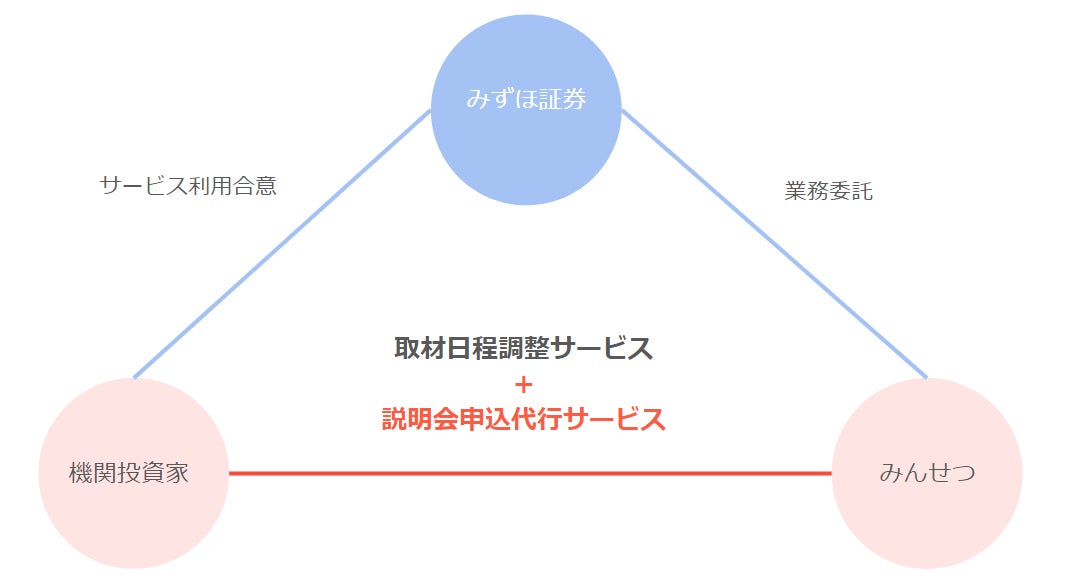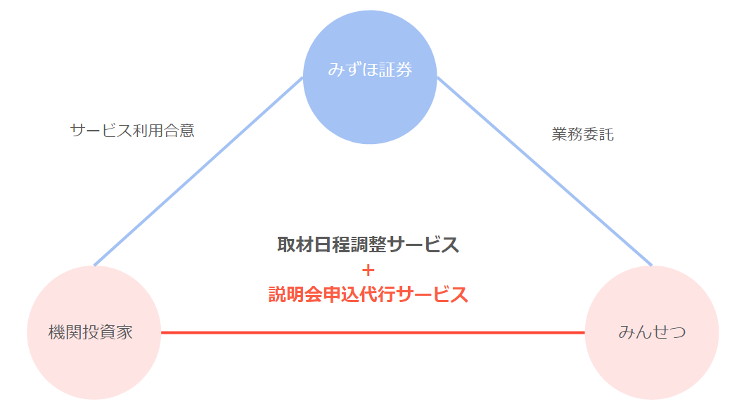 みずほ証券とみんせつの業務委託契約により、みずほ証券の機関投資家のお客様は、今までの取材日程調整サービスに加え、今後説明会参加申し込み代行サービスを利用することが可能になります。