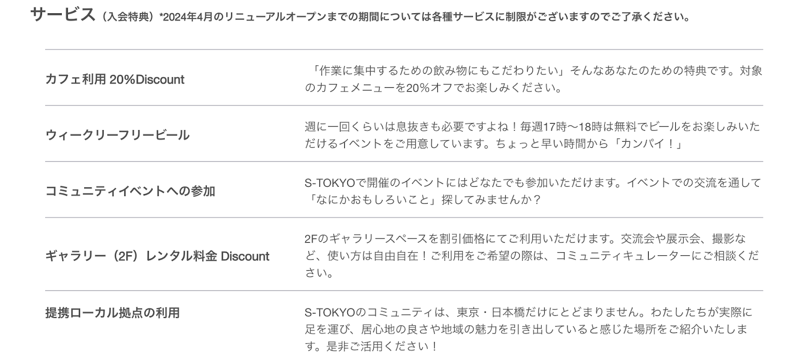 S-TOKYOにご入会いただきますと、入会特典としてウィークリーフリービールのサービスやカフェのディスカウントサービスなどをお受けいただけます。