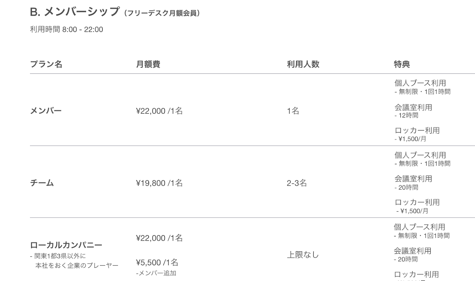コワーキングスペースの利用については、フリーデスクの月額会員プランに加えて、回数券型の「ノマドユースプラン」や、日本国内、関東1都3県以外に本社をおく企業のプレーヤーたちを対象にメンバーシップに割引を適用する「ローカルカンパニープラン」があります。