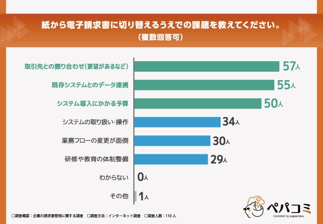 「紙から電子請求書に切り替えるうえでの課題を教えてください。(複数回答可)」と質問したところ、
