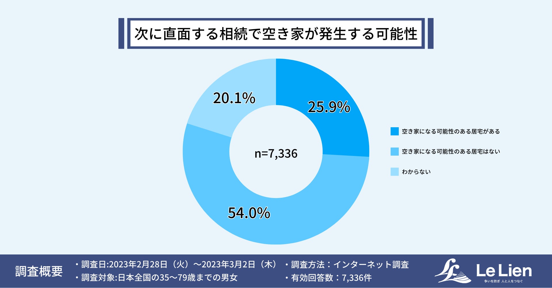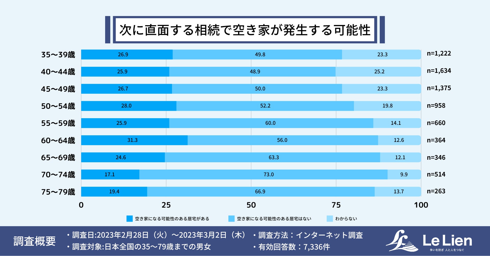 次に直面する可能性のある相続を想像し、相続を通じて空き家になる可能性のある居宅の有無を聞いたところ、ある(25.9%)、ない(54.0%)、わからない(20.1%)という回答の分布になりました。相続後に空き家になる可能性を前もってイメージできている割合は4分の1となりました。平成30年に実施された「住宅・土地統計調査」(総務省統計局)では、空き家数は848万9千戸で全国の住宅の13.6%となっていますが、今回の調査ではそれよりはるかに高い割合で空き家の発生が予想される結果となりました。世代間では、60代までは25%前後で大きな相違は見られず、70代以上では空き家発生を予想する割合が平均を下回っています。