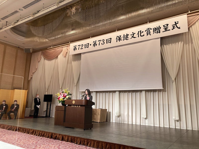 20日(月)は、第73回保健文化賞の受賞者(9団体、5個人)を代表し、当法人の理事長・松本亜樹子が代表者挨拶をさせていただきました。その後、同席の受賞者の皆さまから「感動しました」「涙が出る思いでした」「ジーンとしました」などのご感想をいただきました。
