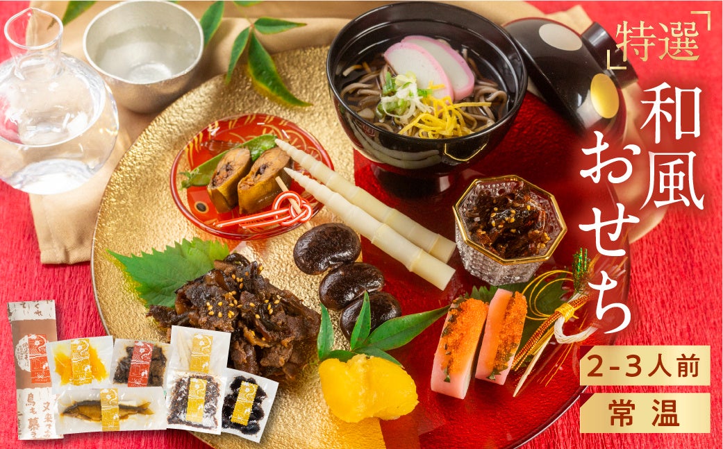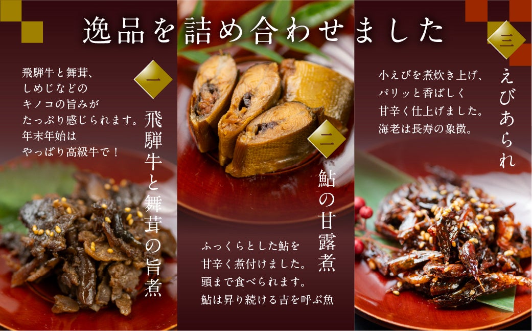 容量 | ①飛騨牛とマイタケの旨煮 ②鮎のぼっか煮 ③えびあられ ④花まめ ⑤ひめたけの醤油煮 ⑥年越しそば ⑦栗きんとん |