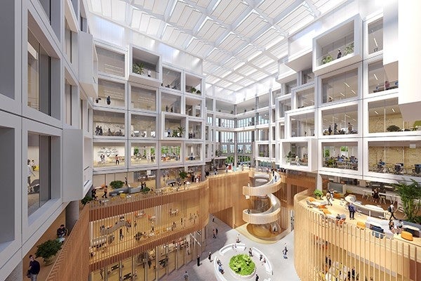 ワーカーにとって快適な空間を演出するため、施設中央部のアトリウムを囲むように配置されたラボからは、周辺の公園や川を見渡せます。