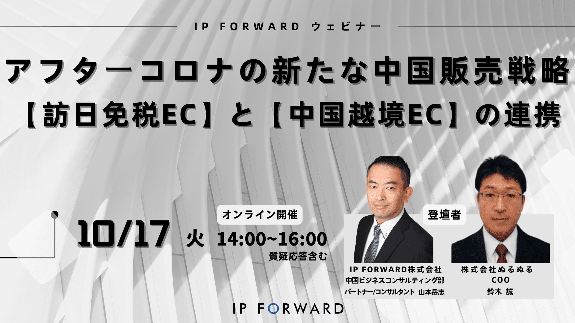 これらの新たな動向に焦点を当て、今回のIP FORWARD株式会社と株式会社ぬるぬるの共催ウェビナーでは、日本初登場の免税ECとファン囲い込み型の中国越境ECの概要、それらの連携の可能性について、ご紹介させていただきます。