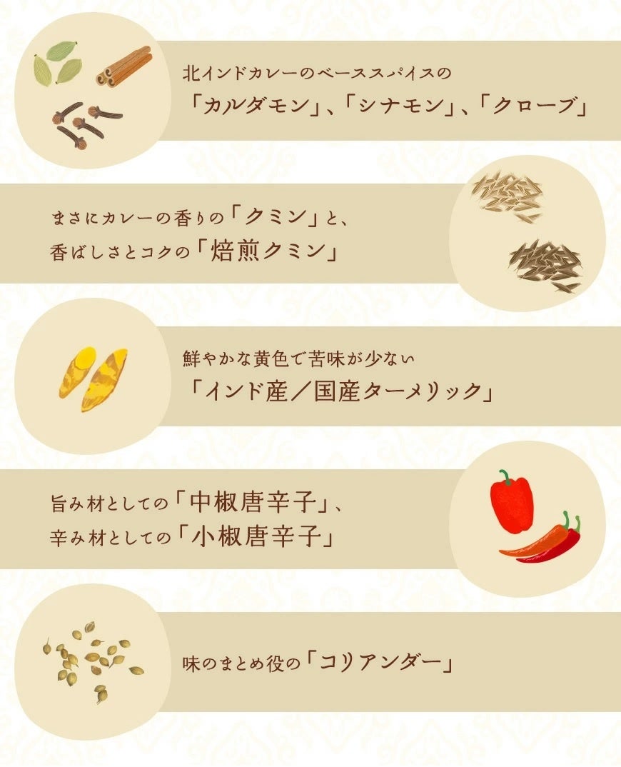 北インドカレーのスパイスの基本である「カルダモン」、「シナモン」、「クローブ」をベースとして、香ばしさとコクの「焙煎クミン」、鮮やかな黄色で苦味が少ない「国産ターメリック」などを加えることで、北インドの現地感を表現しながら、オリジナリティもプラスした本格的なカレーパウダーに仕上げました。