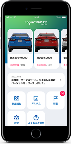 「cogniPHOTOBASE mobile」は自動車修理工場向けの事故車撮影アプリです。交通事故等で破損した自動車の修理費用を自動車保険金で賄う場合、多くの自動車修理工場では修理前の損傷状態を撮影し、その画像を弊社のファイル共有・コミュニケーションサービス「cogniPHOTOBASE」などを使用して損害保険会社へ送信し損害額の協定を行っていますが、正確な損傷状況を共有するために、適切なアングルで撮影された画像が必要不可欠です。cogniPHOTOBASE mobileでは撮影する際に、損傷個所に応じた最適な撮影方法をアプリがナビゲートし、見積作成や協定作業をサポートします。