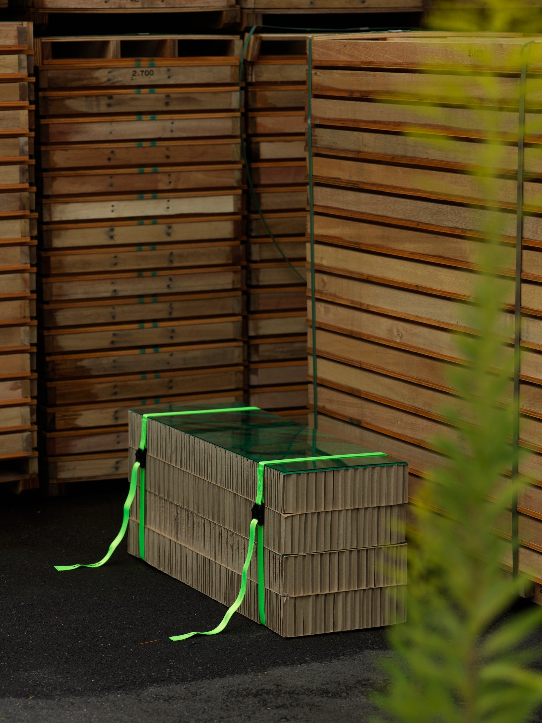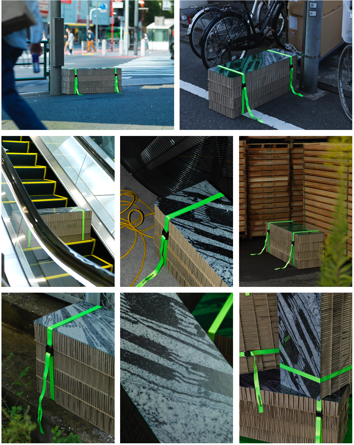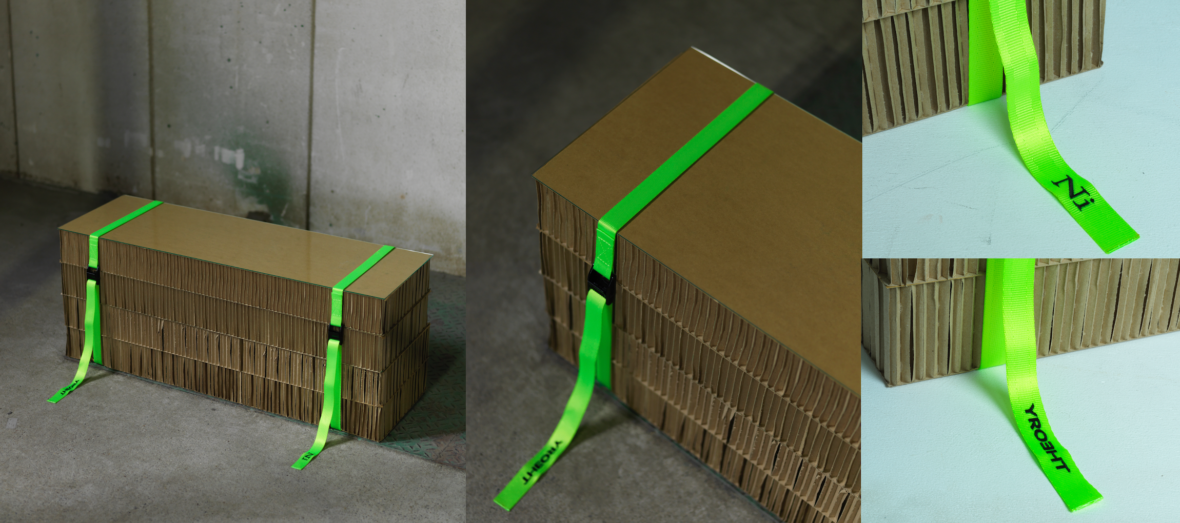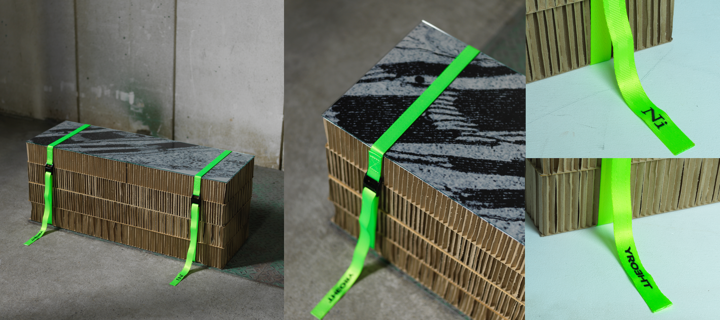 Niは、輸送される荷物が最終梱包された状態=「荷姿」から着想したインテリアオブジェクトです。「荷姿」の凛とした佇まいや、受け手に届いた後に解体されてしまう儚さからインスピレーションを得ました。ベンチやテーブルとして使用することが可能です。