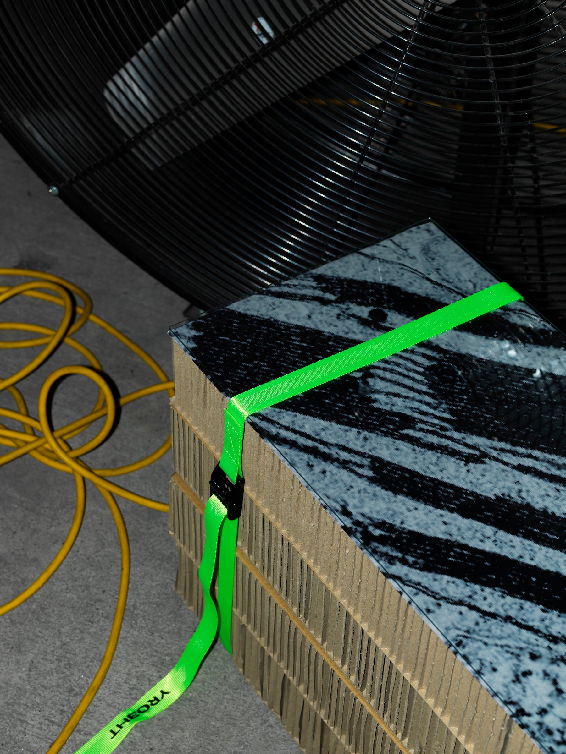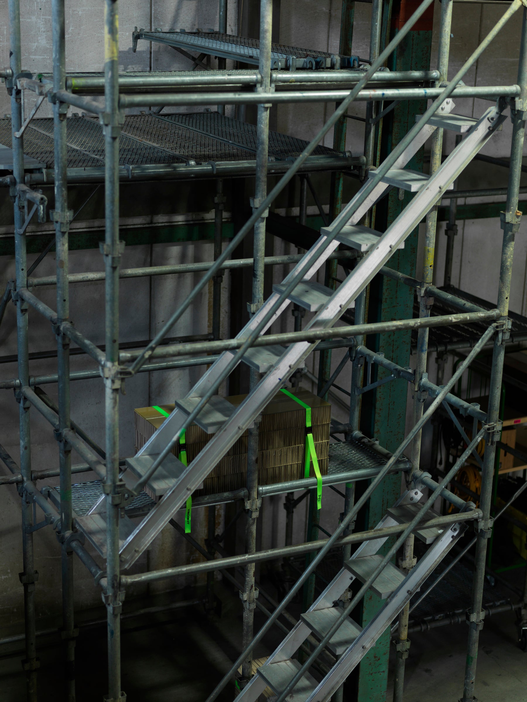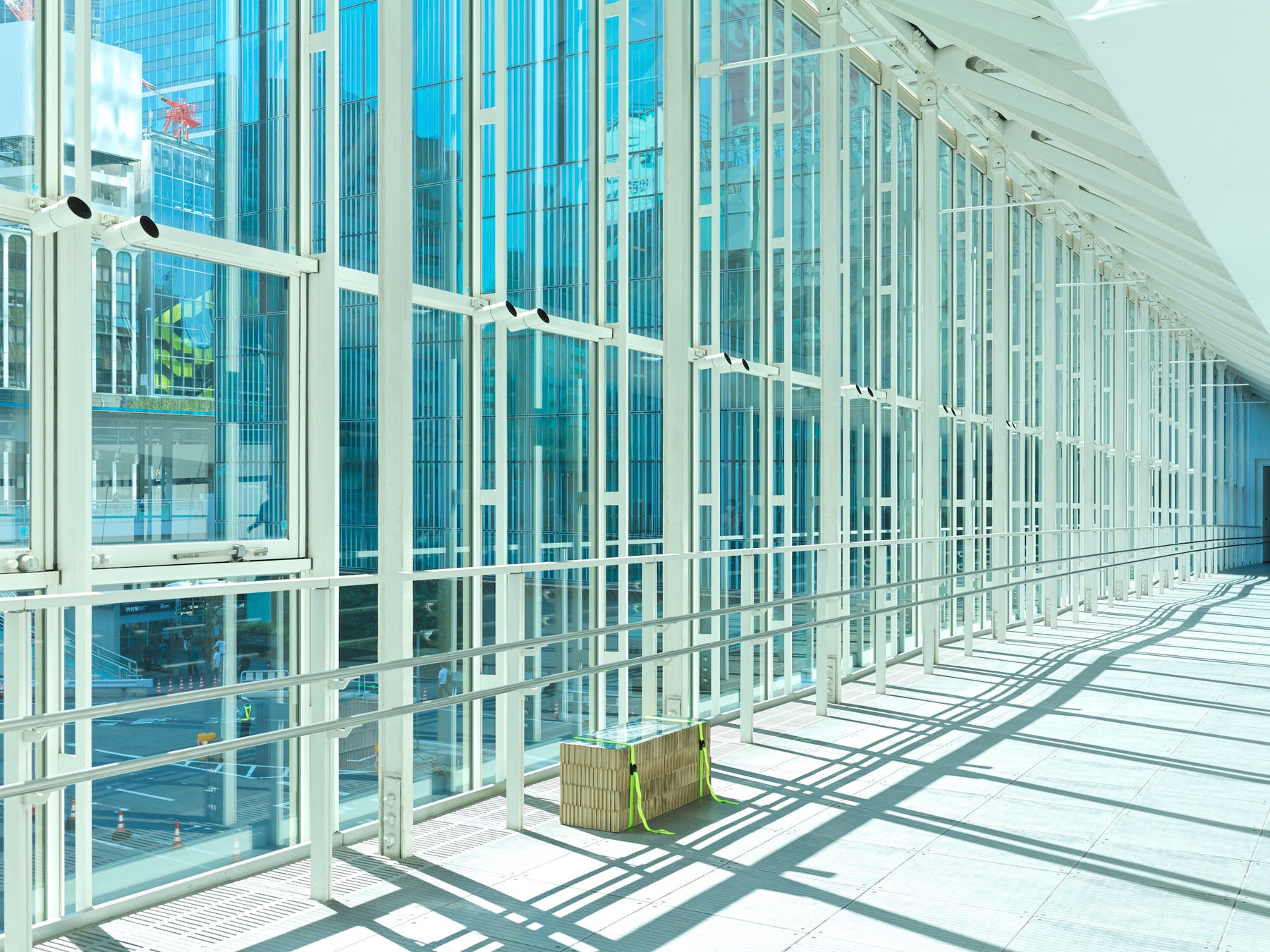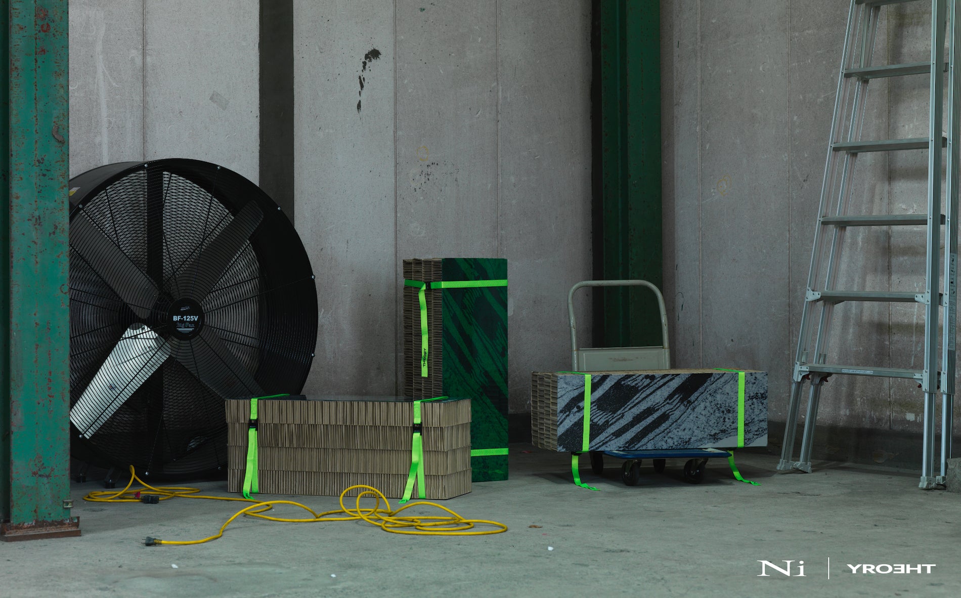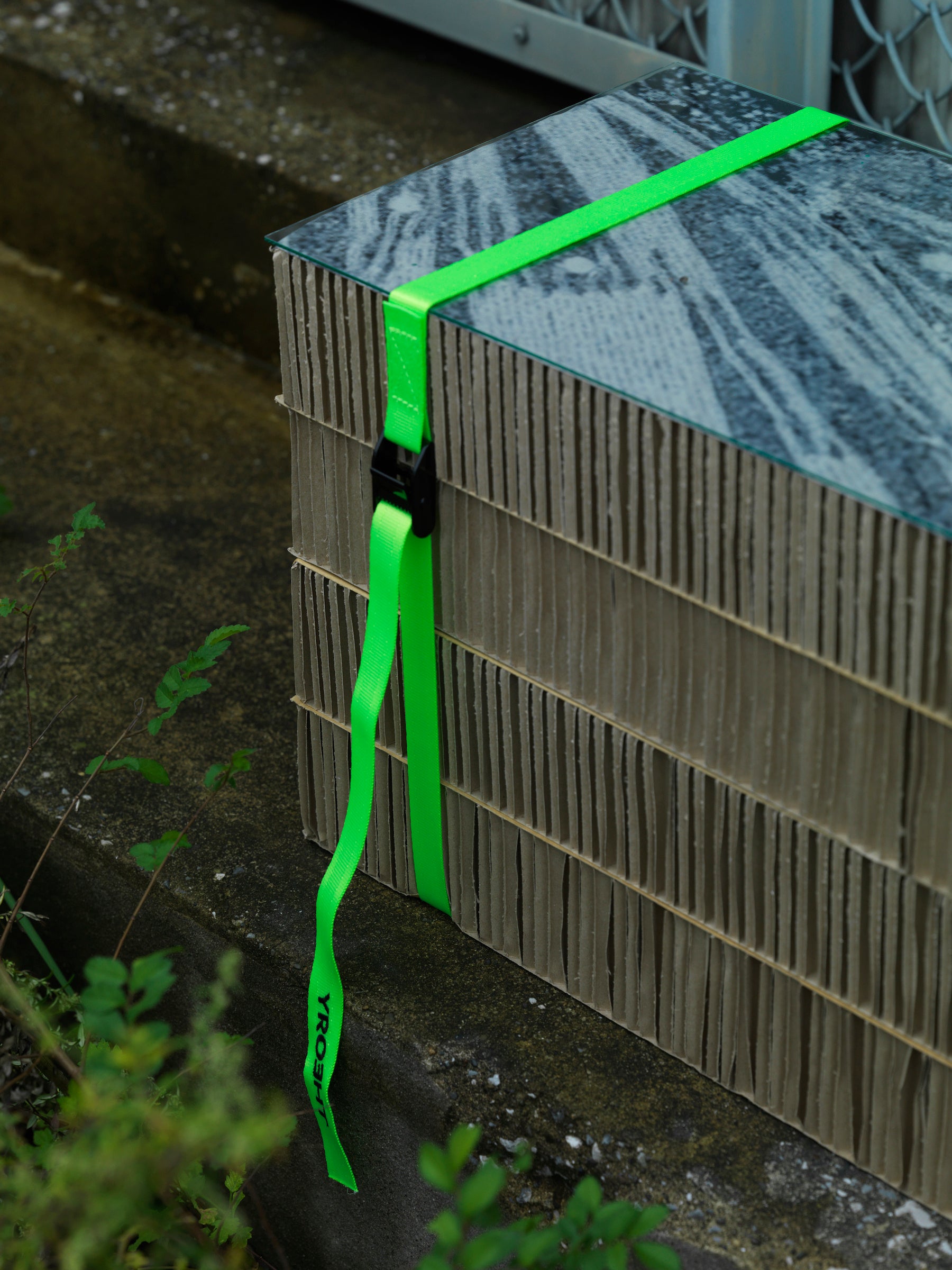 Niは、輸送される荷物が最終梱包された状態=「荷姿」から着想したインテリアオブジェクトです。「荷姿」の凛とした佇まいや、受け手に届いた後に解体されてしまう儚さからインスピレーションを得ました。ベンチやテーブルとして使用することが可能です。