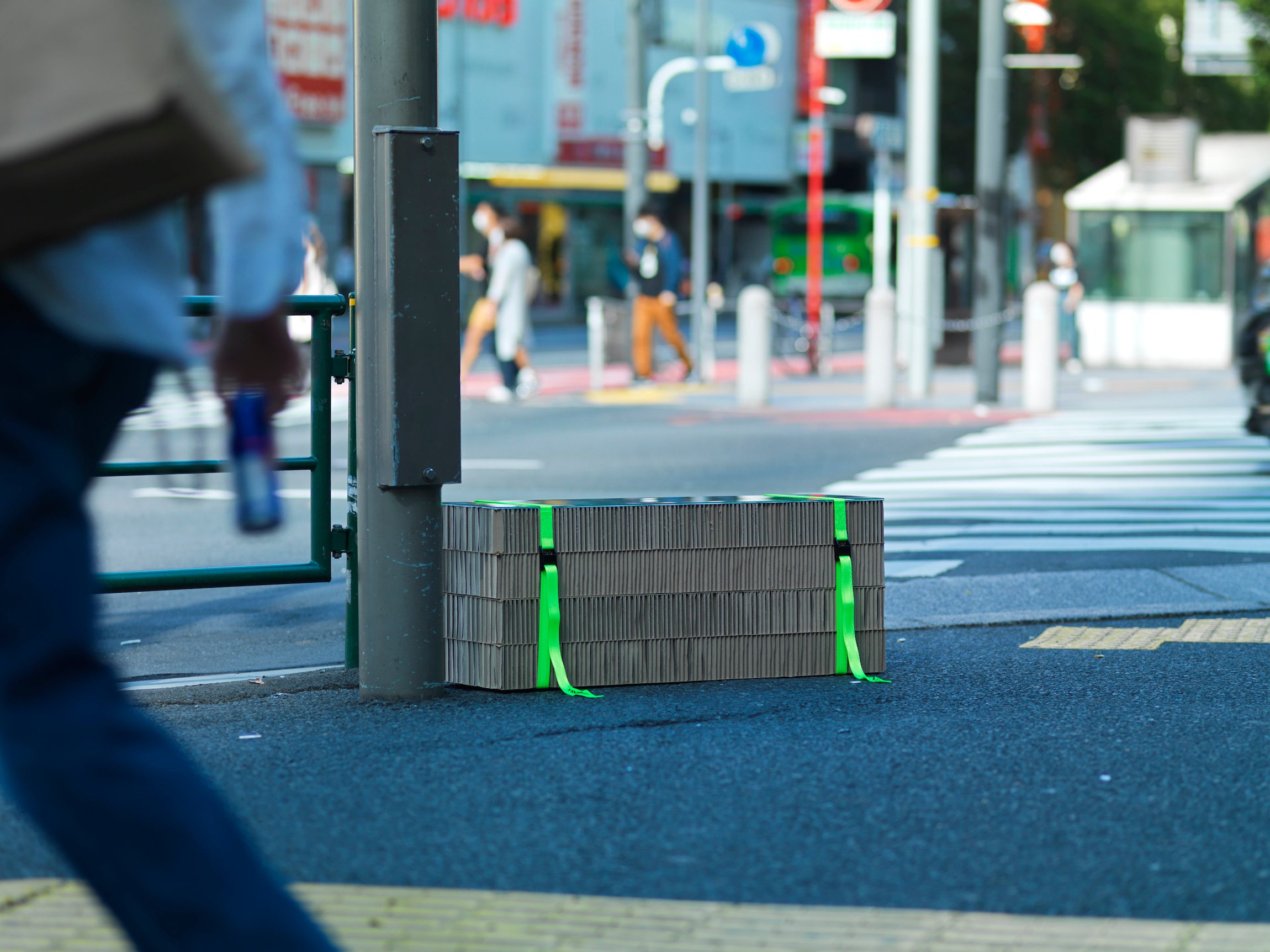 軽さと強さの両立を目指して航空産業の中で発達を見せたハニカム構造体。この構造体を段ボール製造に活かすことで生まれたペーパーハニカムは、紙製でありながら圧倒的な強度と軽さを両立しています。また上下方向の圧力に強く、温度湿度変化等による反りに対しても強力な耐性を有しています。このペーパーハニカムを応用することで耐久性とポータブル性の高いベンチを製作しました。ペーパーハニカムの製造は旭紙業株式会社にサポートいただきました。