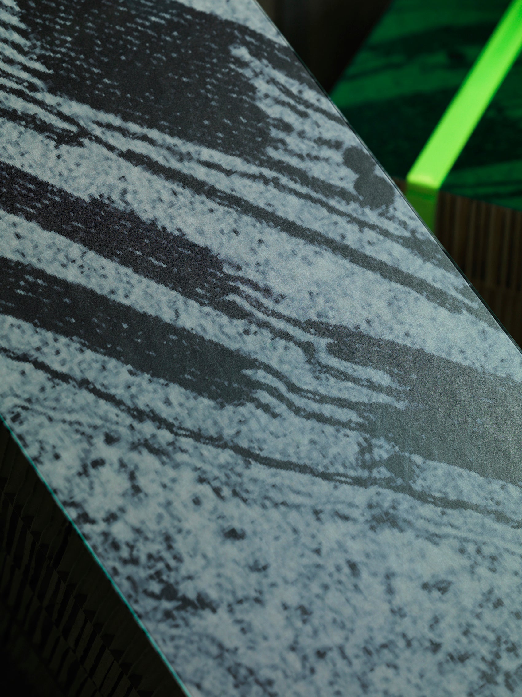 ベンチの座面に、植物細胞の柄を施したエクスクルーシブモデル。荷姿の凛とした佇まいや解体されてしまう儚さを「植物が宿す生命感」と紐付けて表現しました。葉緑体をモチーフにしています。