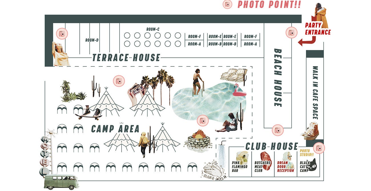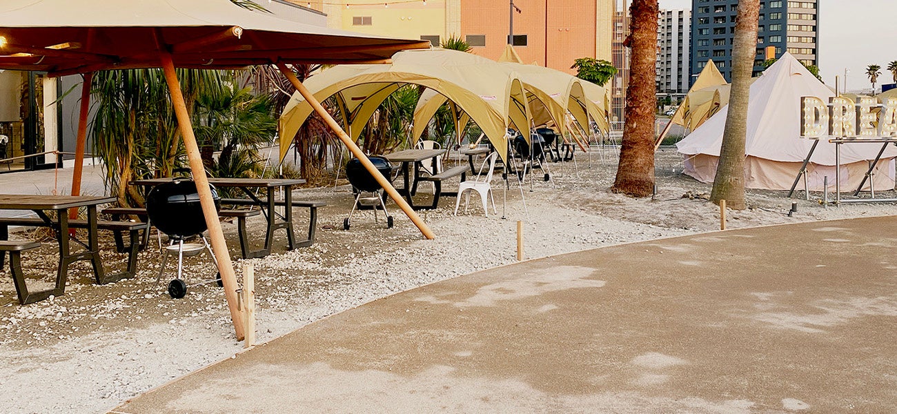 BEACHの奥に広がるグランピングスタイルのCAMPエリア