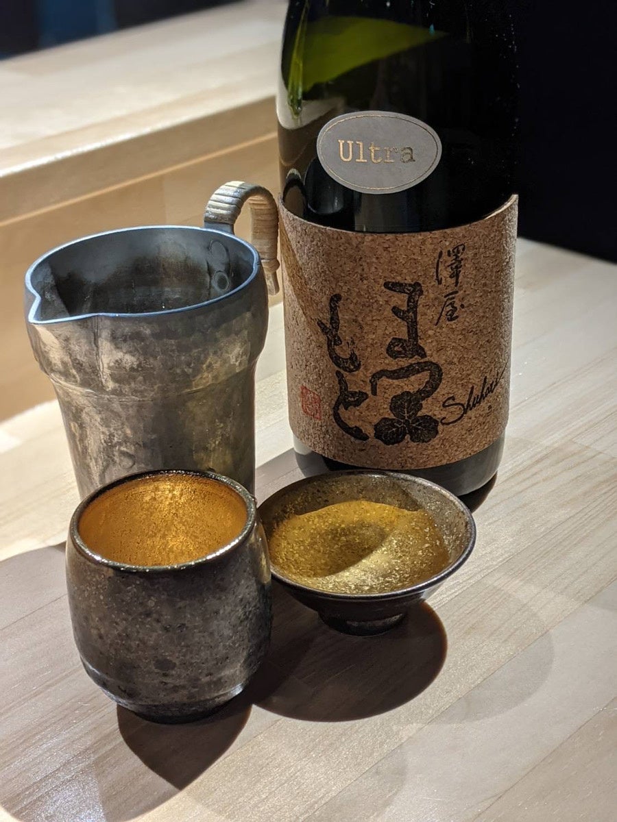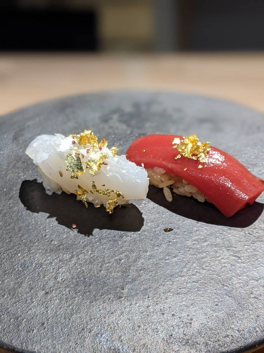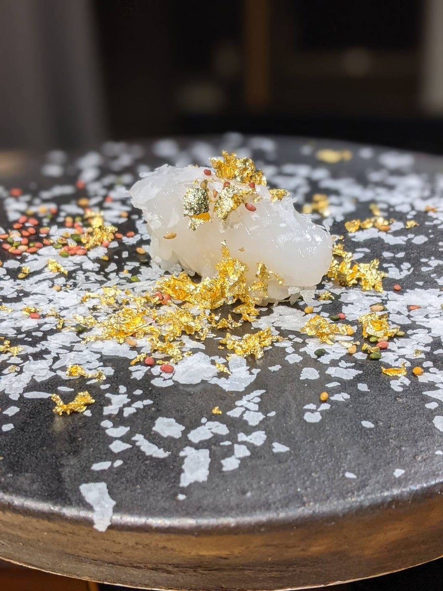 <左から、目にも鮮やかな金まみれのイカの鮨、金の食前酒>
