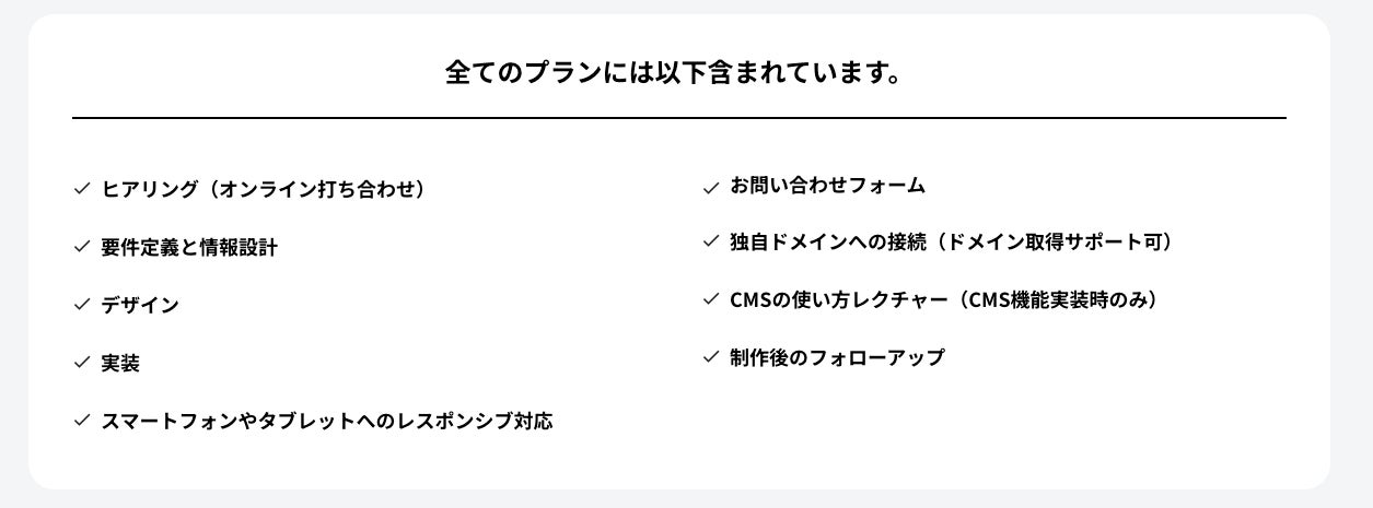 修正対応の範囲や回数も明記しているため、Web制作の知識や経験が少ない方でも安心してご相談いただけます。
