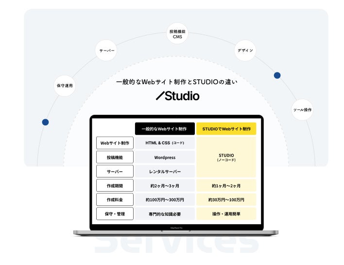 本サービスは、「何から始めればいいか分からない」「エンジニアがいないのでサイト更新ができない」などの悩みを持つ中小企業のご担当者向けに、限られた予算・人手・時間の中でも、実用性とデザイン性を両立したWebサイトを制作・リニューアルできるサービスです。ノーコードツール「Studio」を活用することにより、スピーディかつリーズナブルなサイト構築を実現します。