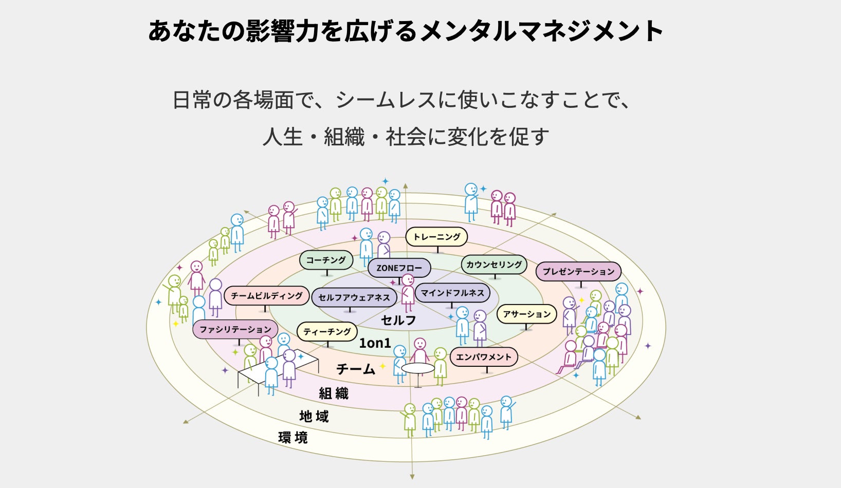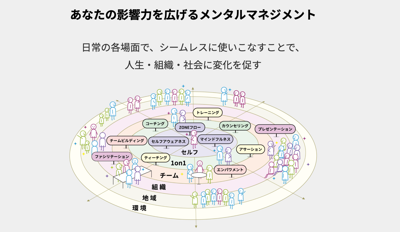 一人ひとりのメンタルが整い、周りの人と信頼関係を築き、好き得意で貢献し合う。「誰もが幸せを感じられる世界」を、私達の身近から一歩ずつ作ろうとの想いを込めました。