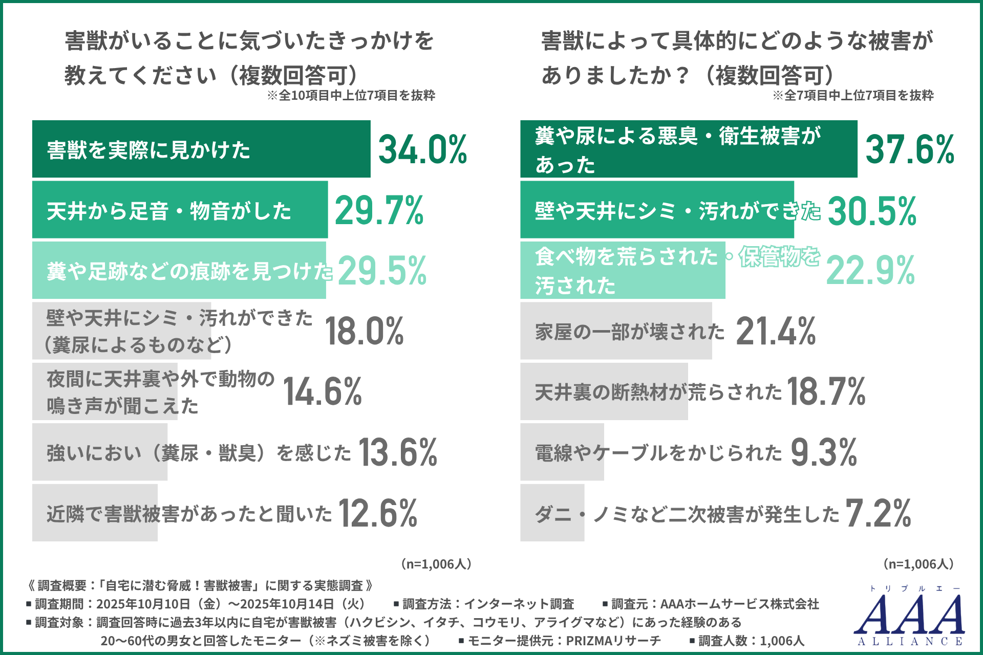 駆除ザウルス(運営:AAAアライアンス、所在地:東京都世田谷区、代表取締役:西岡 徹也)は、過去3年以内に自宅が害獣被害(ハクビシン、イタチ、コウモリ、アライグマなど)にあった経験のある20〜60代の男女を対象に、「自宅に潜む脅威!害獣被害」に関する実態調査を行いました。