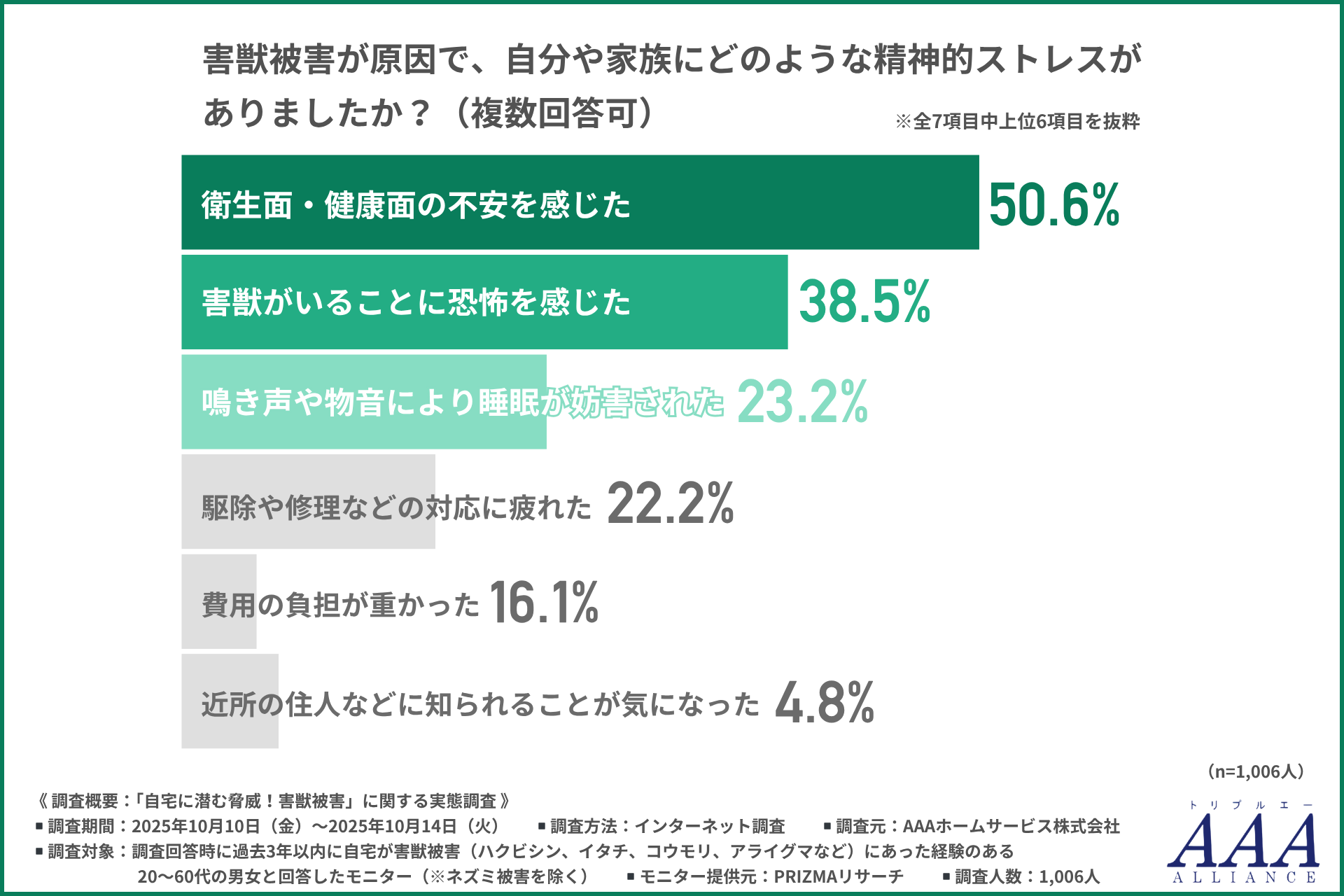 害獣による被害の中心は悪臭や汚損といった衛生被害が多く、さらに「衛生面・健康面の不安」「恐怖」「睡眠妨害」といった精神的ストレスも多くの方が経験しています。