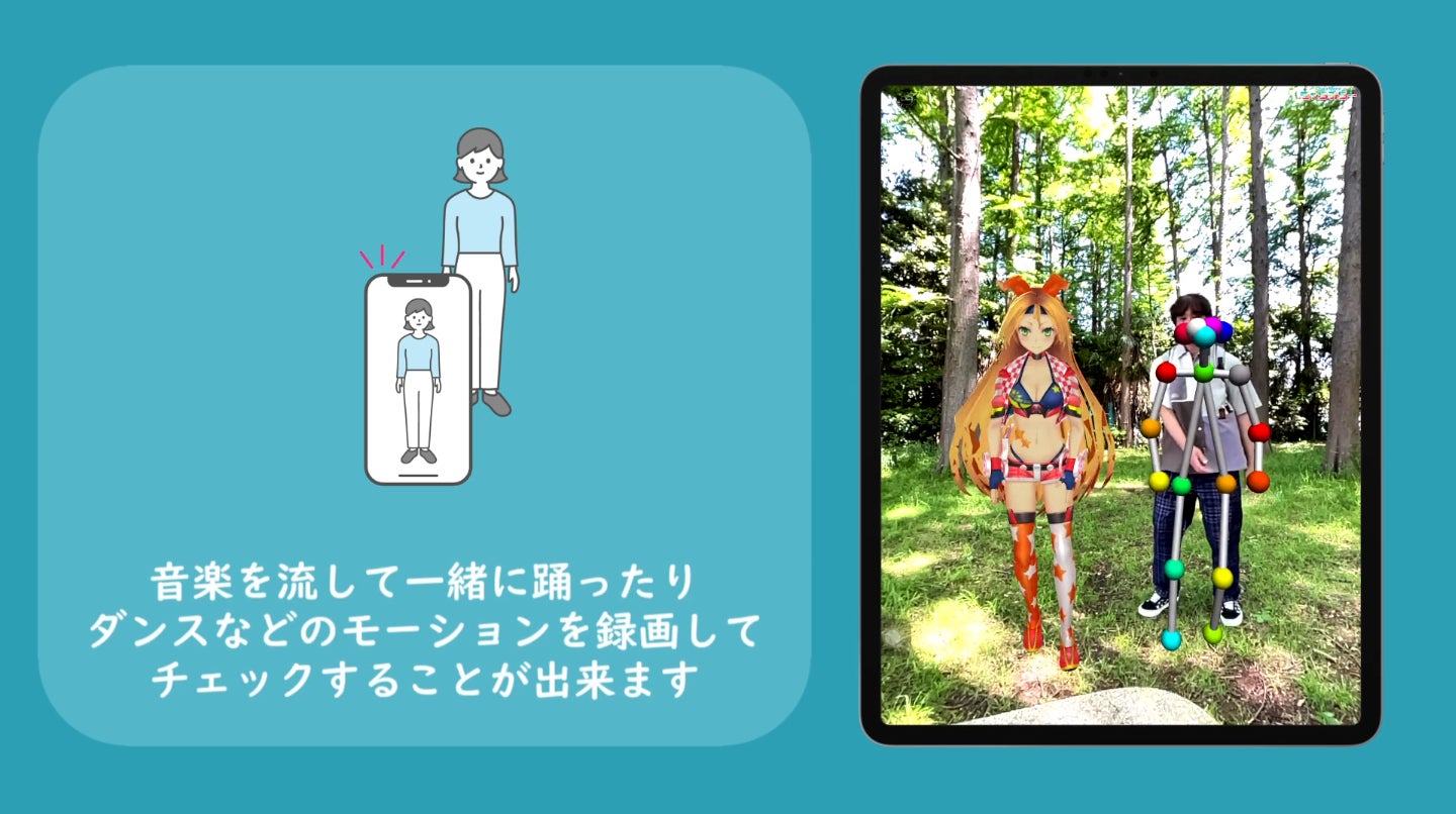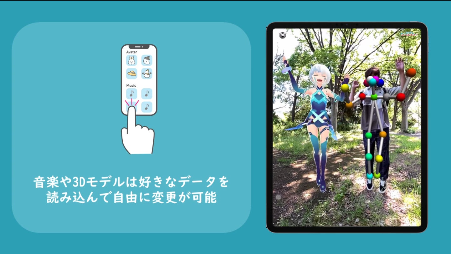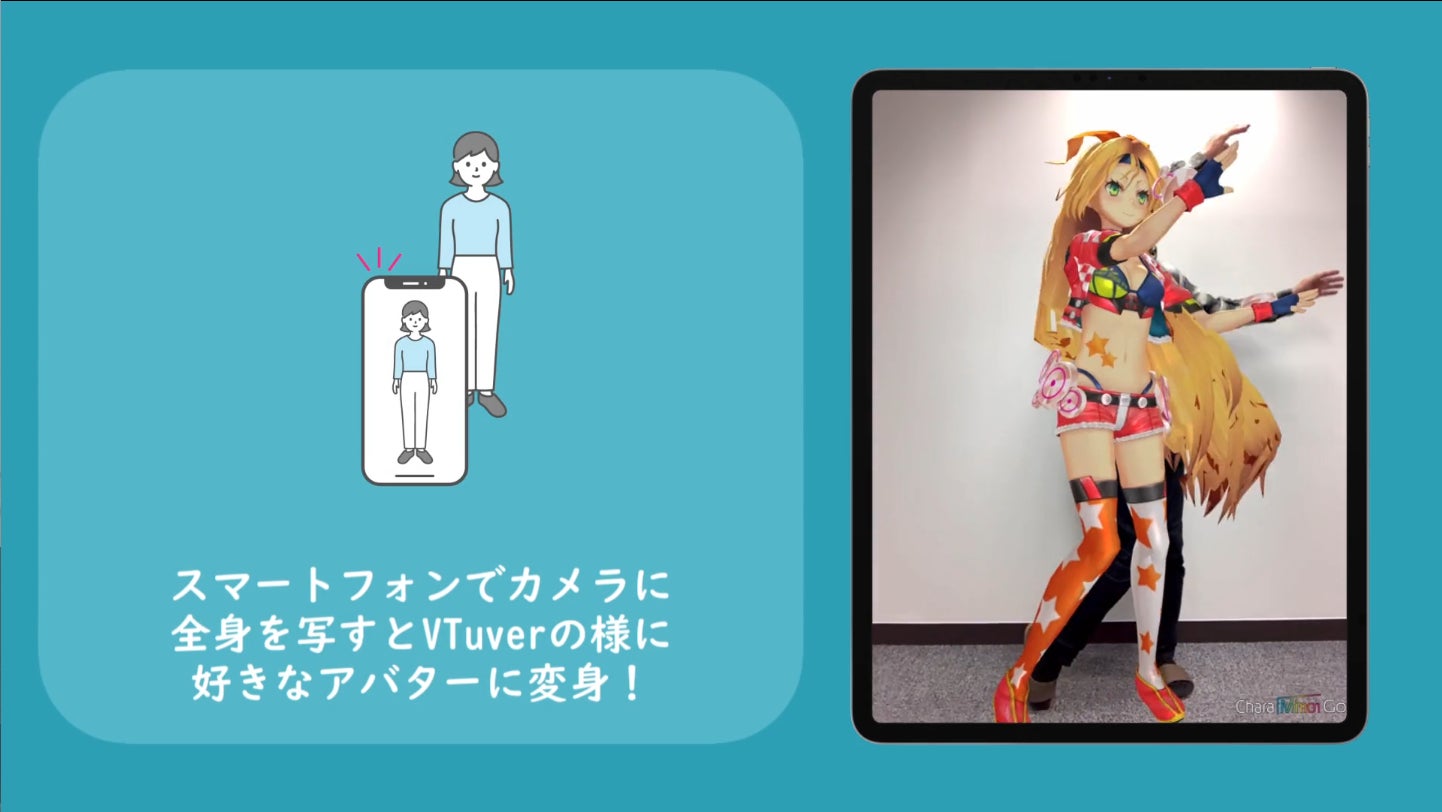 そして、ToF ARの機能を手軽に体験できるサンプルとして、これまで様々なイベントに出展してきた『きゃらみらー』とToF ARを組み合わせ、『Chara Mirror Go』アプリを開発しました。これまでの『きゃらみらー』は体験するためにKinectを接続したPCを準備する必要があったのに対し、本アプリではToF ARを導入したことで、お手持ちのスマートフォンにアプリをインストールするだけで誰でも手軽に遊べるようになりました。