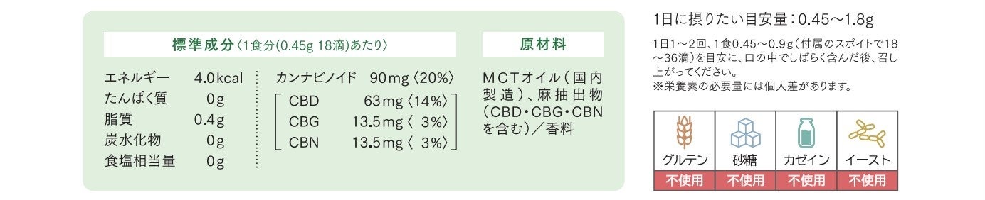 『CBDオイル20』は「CBD」14%のほか、植物にわずかしか含まれない希少な成分「CBG(カンナビゲロール)」と「CBN(カンナビノール)」を3%ずつ組み合わせ、合計20%のカンナビノイド成分を配合しています。