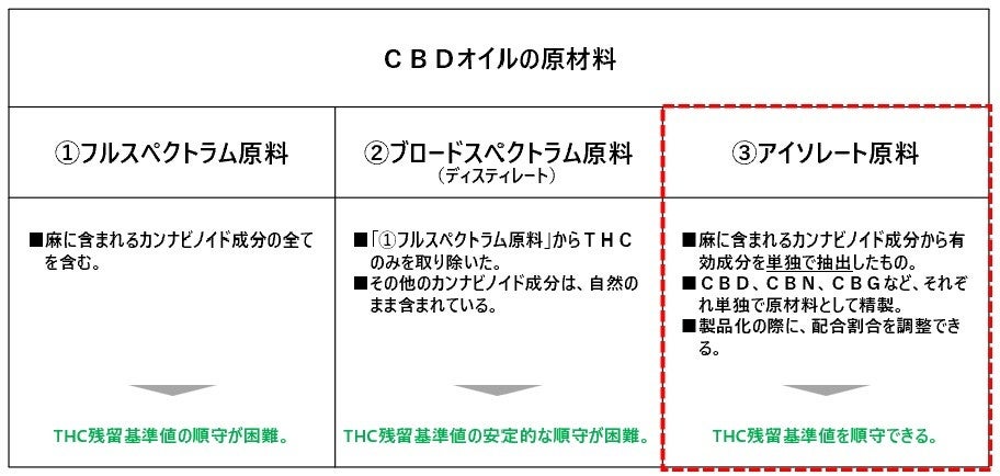 THCの残留濃度が基準よりも低いことが、安心して使用できるCBDオイルの絶対的な条件となります。その条件を満たすため、株式会社MSSの医療機関専用サプリメント『CBDオイル20』では「アイソレート原料」(下表③)を採用することで、THCの残留濃度10ppm以下を実現しています。