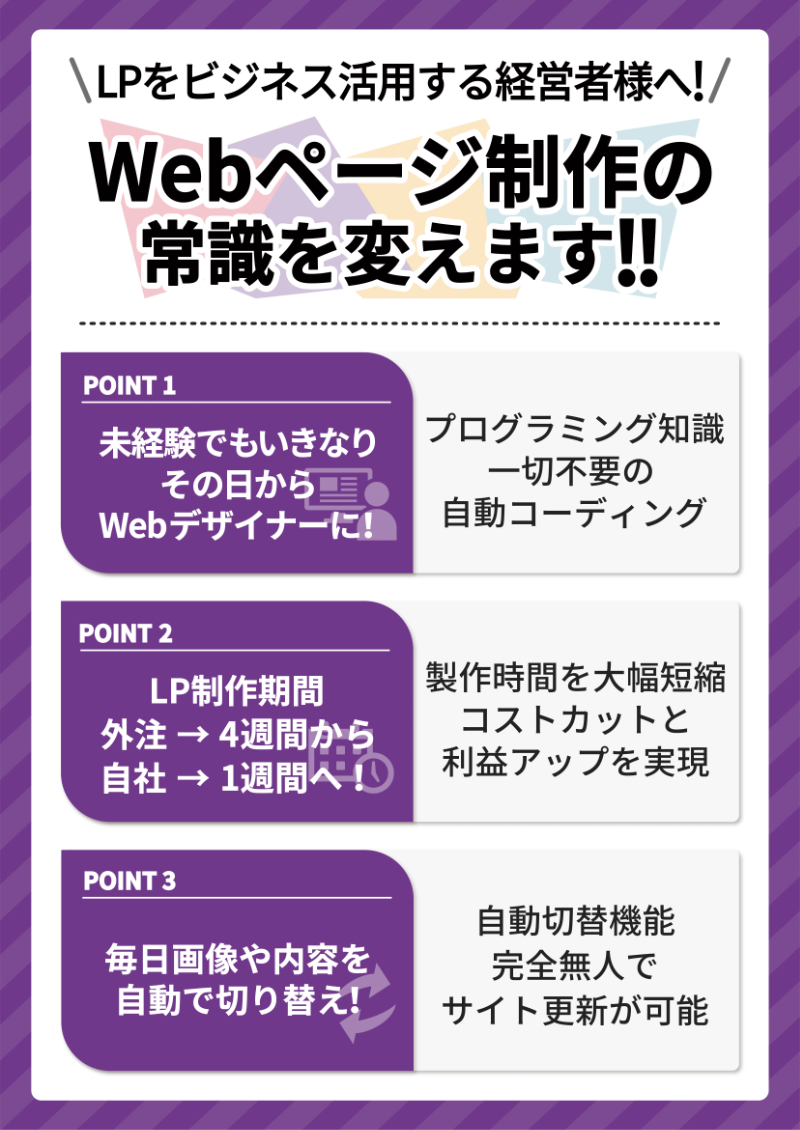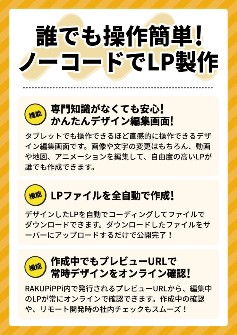 【内容】誰でも簡単にランディングページ(LP)が製作できるノーコード開発クラウドサービス