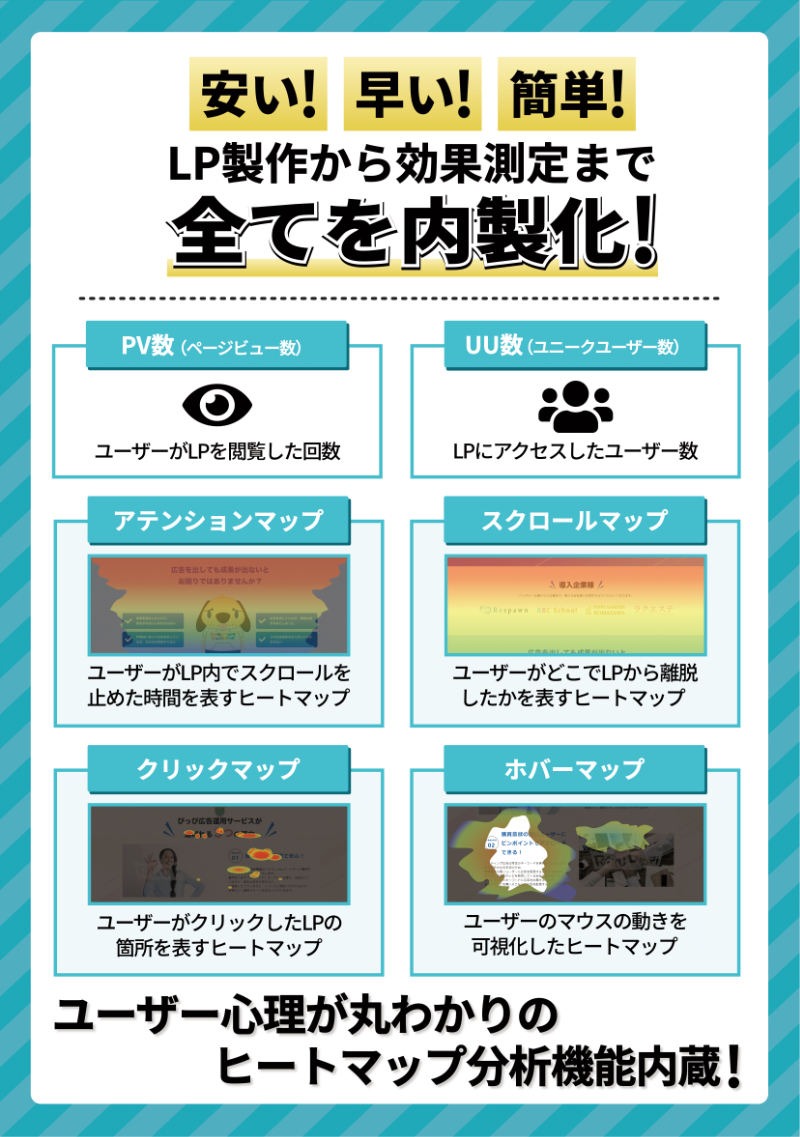 公開したLPの訪問ユーザー数を計測した【PV数】【UU数】や、ユーザーの動向を視覚的に表示した4種のヒートマップが確認できる、解析機能を搭載。